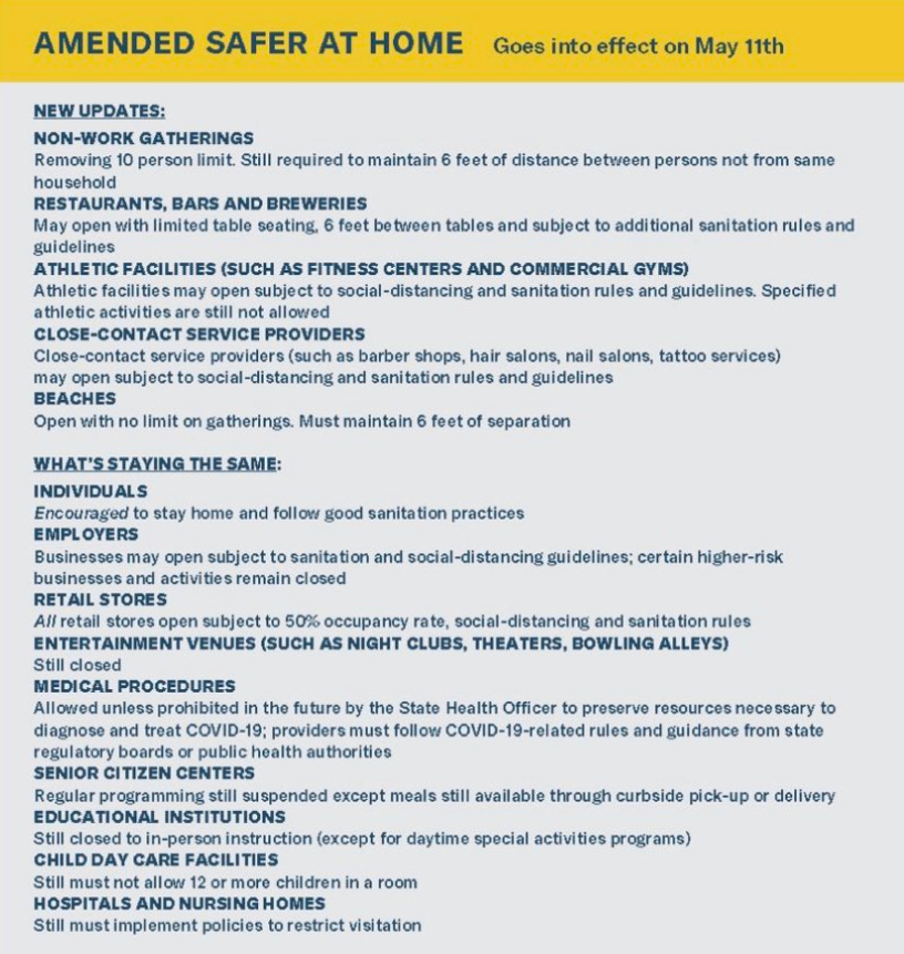 - Gyms, athletic facilities may open, but with social distancing guidelines.