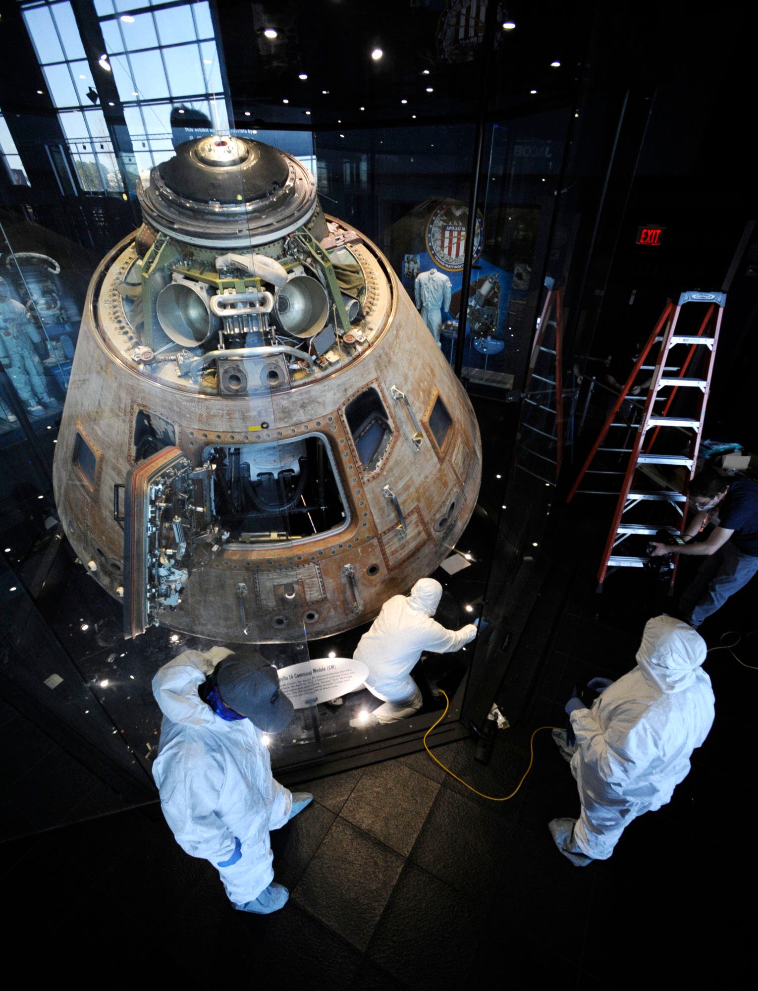 A crew of workers has been assembled to get the spacecraft ready in time for the 50th anniversary of its April 1972 flight. Dozens of items were removed from the glass enclosure that surrounds the capsule, while workers wiped down the 6.5-ton, nearly 11-foot-tall craft.