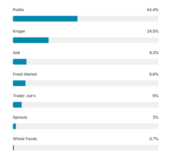 That said, there was a clear stand out in our reader poll: Publix, with over 44% of the votes. Kroger came in second, with just under 25%, and Aldi with 9%. Here’s the breakdown:
