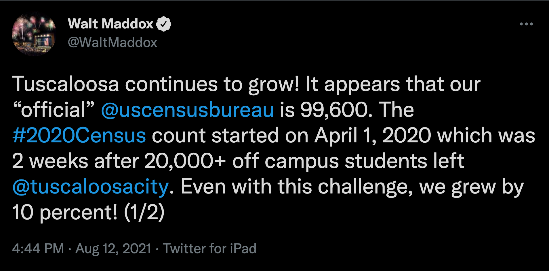 "Even with this challenge, we grew by 10 percent," Maddox said on Twitter Thursday, before going on to explain that city officials were worried that Tuscaloosa's population might drop below its number reflected in the 2010 Census.