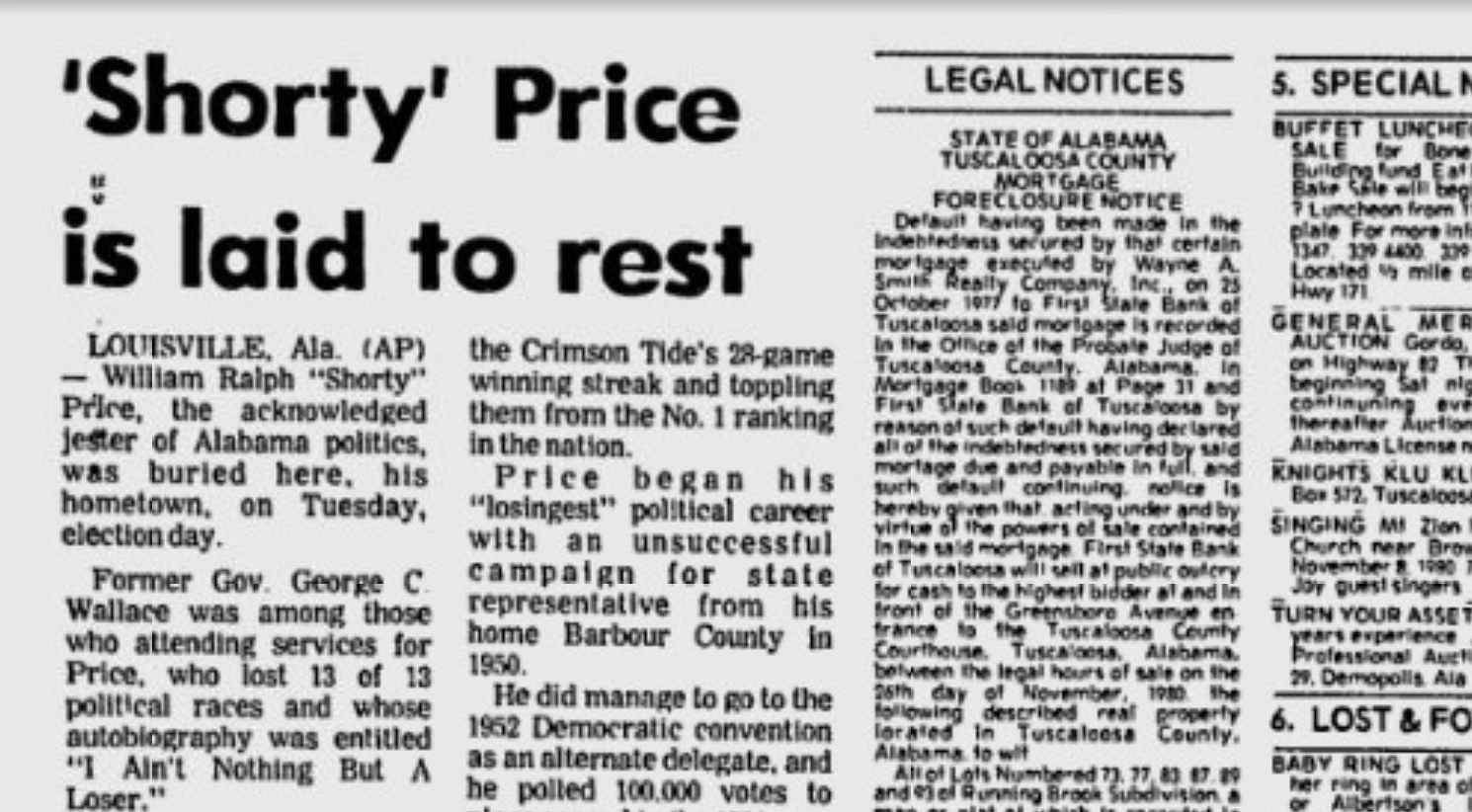 It remains unclear exactly how many unsuccessful campaigns Price pursued apart from his 13 attempts at the state's highest office. But in 1978 he grabbed headlines once again by saying he would run for governor a final time before retiring from political life to focus solely on selling insurance in the off-season and his longtime love of Crimson Tide football.