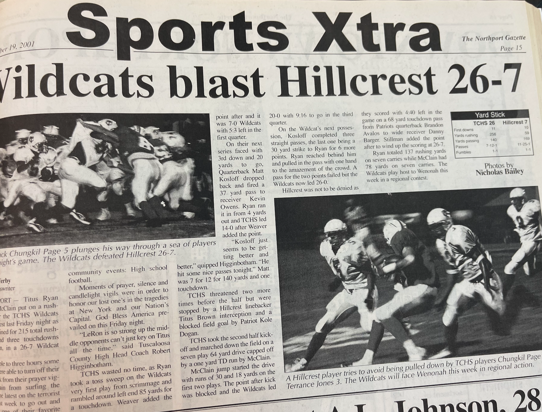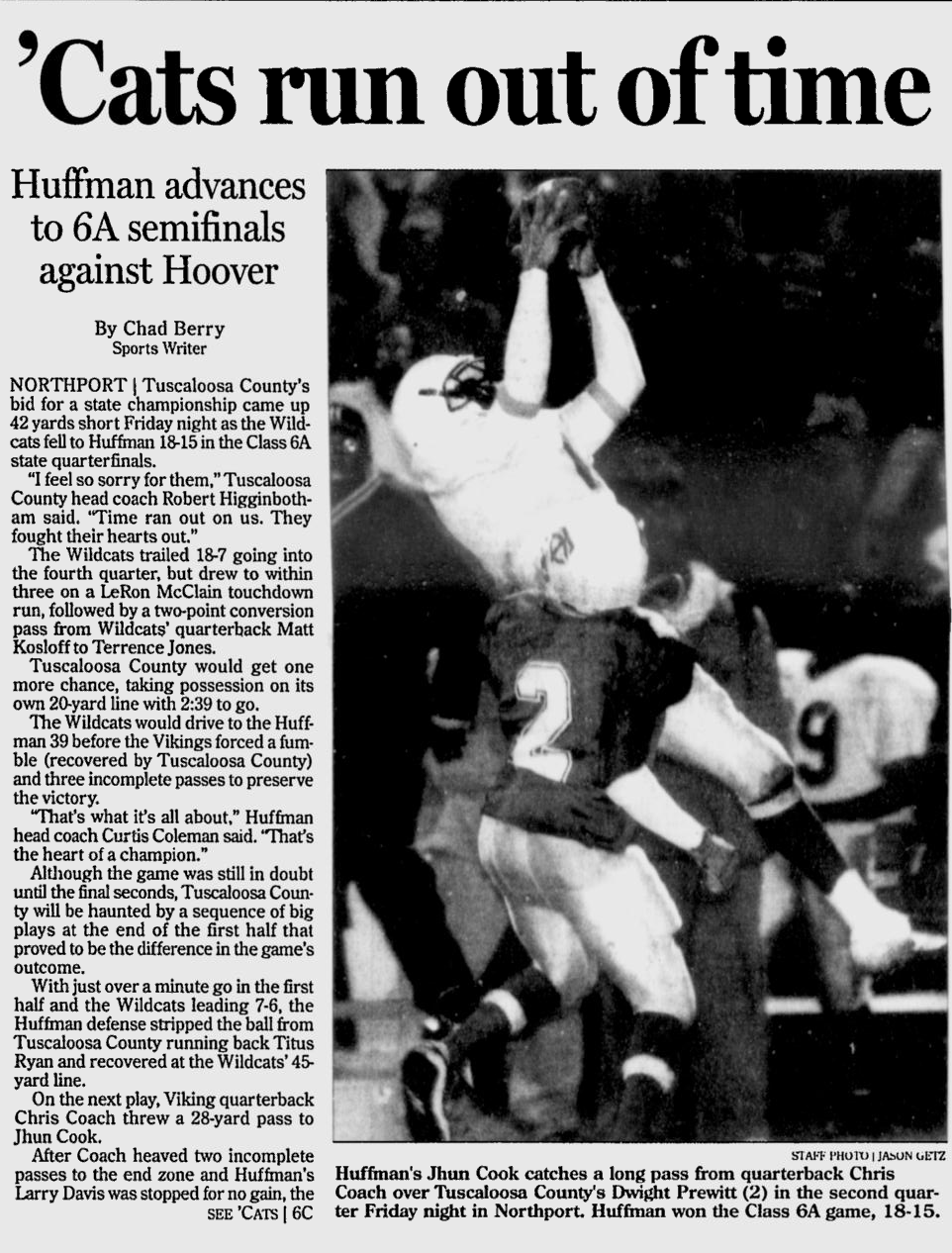 Charles Yerby of the Gazette wrote that TCHS quarterback Rickey Montgomery got the Wildcats on the board first with a 34-yard touchdown strike to Johnathan Cole, before County High missed the extra point.