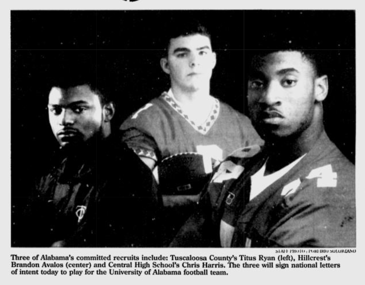 But this was the hobbled Dennis Franchione era at The Capstone and everyone around at the time remembers the backyard talent in the signing class for the University of Alabama in February 2002: Quarterback Brandon Avalos from Hillcrest, defensive lineman Chris Harris from Central, and the speed demon Titus Ryan from County High.