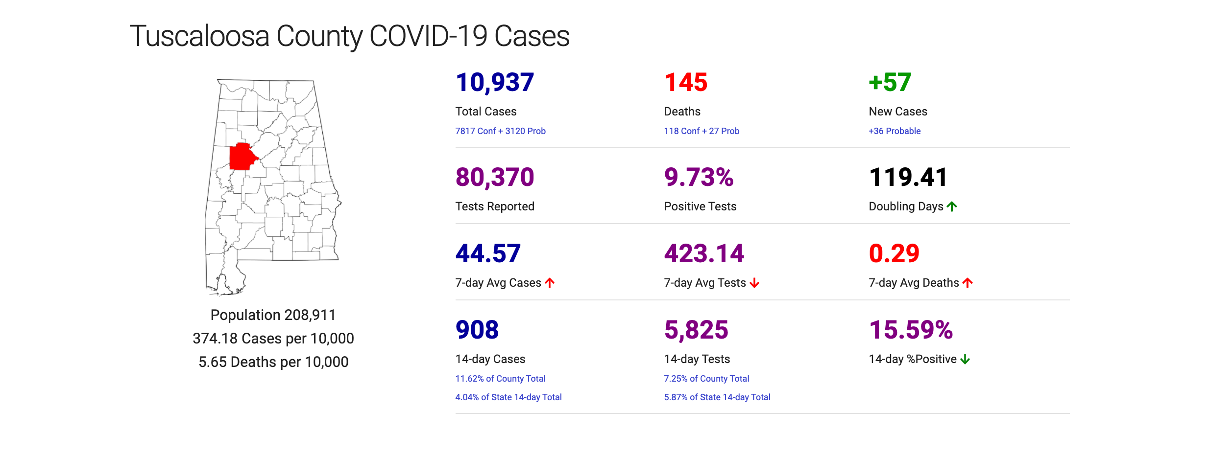 As of Wednesday, Bamatracker.com — an independent online data source used statewide and by the city of Tuscaloosa — reported 7,817 total cases for Tuscaloosa, with 118 confirmed deaths to-date.