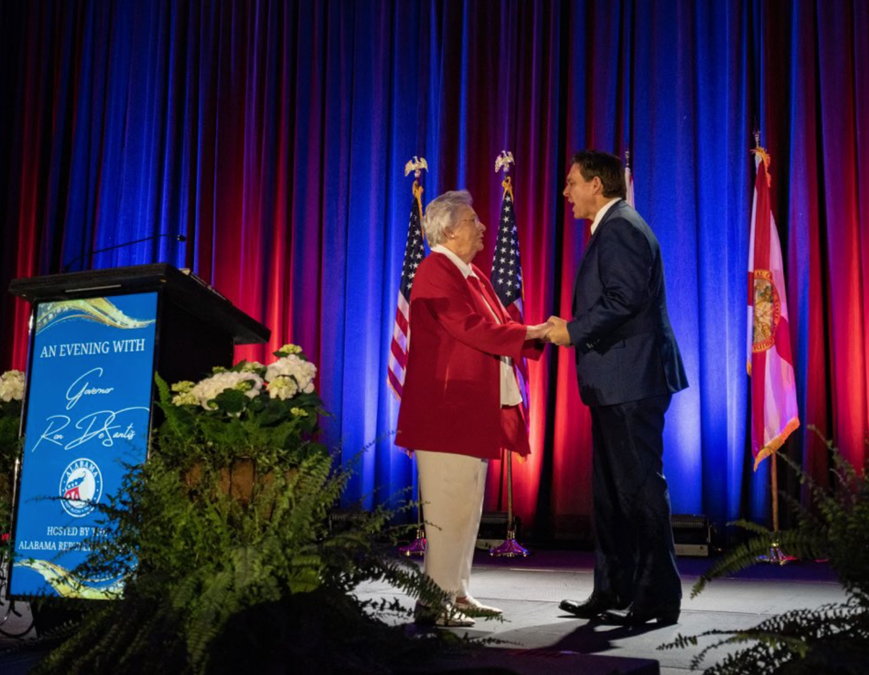When the heavy red and blue curtains were thrown back, DeSantis — not standing all that much taller than Ivey — took the stage to the loudest applause of the evening.
