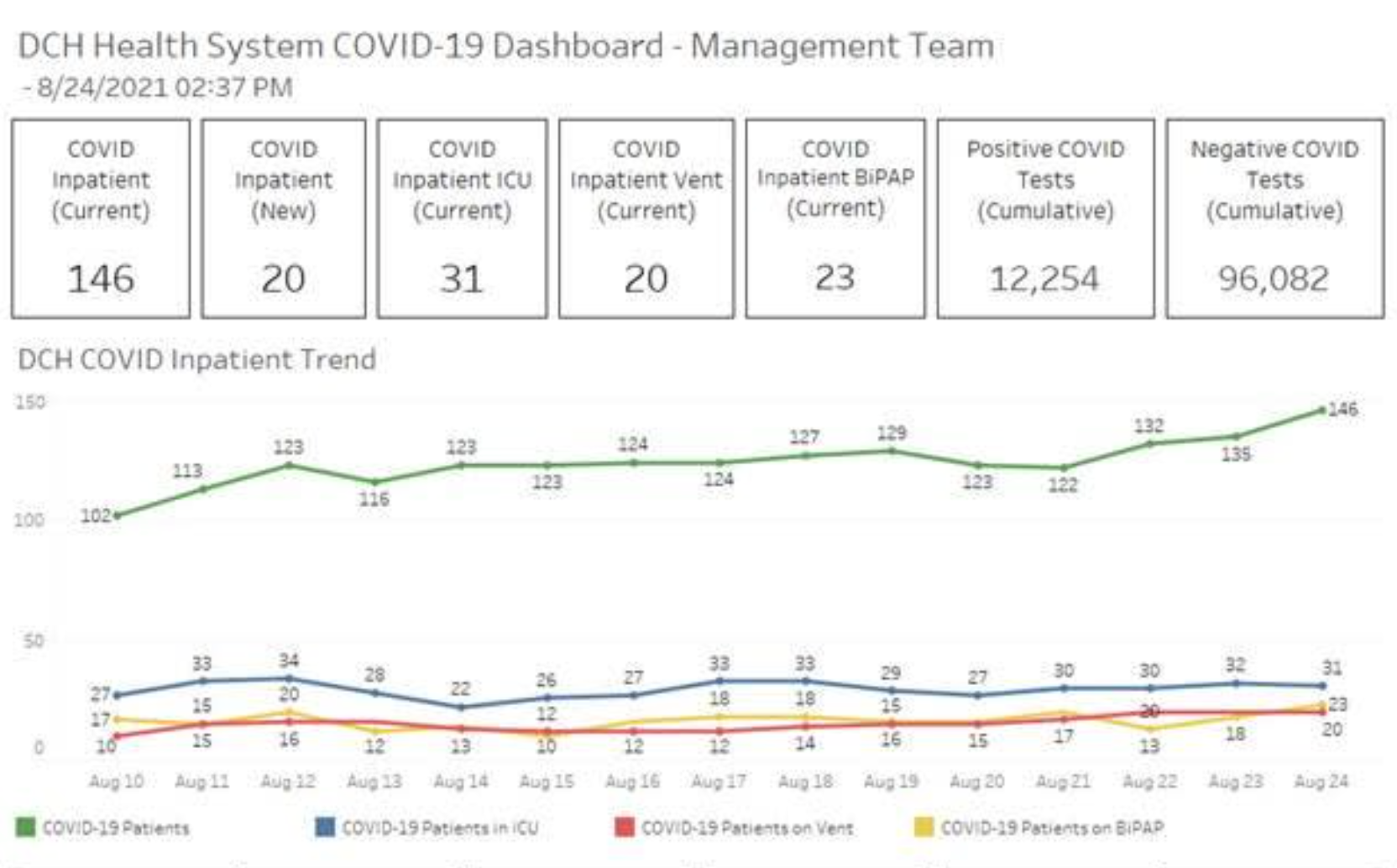 The jump in demand comes at not a moment too soon, either, as DCH reported 20 new hospitalizations in a single day on Tuesday , bringing the system's overall inpatient total to 146, which is down slightly from the new high the system hit on Monday. Of those patients, roughly 88% have not been vaccinated.