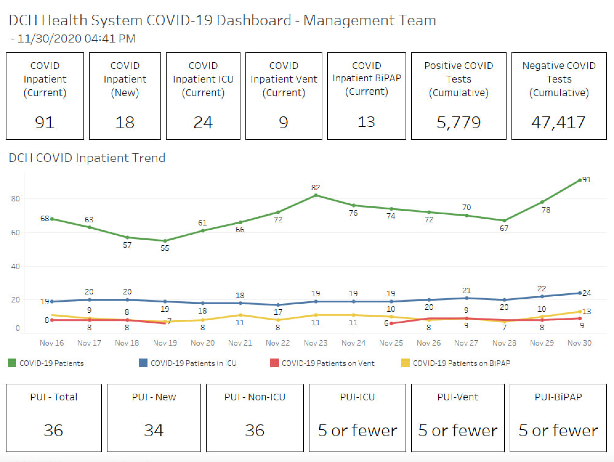 The spike in new COVID-19 inpatients for DCH is also in line with state and national trends as public health officials caution of an accompanying surge due to gatherings over the Thanksgiving holiday.
