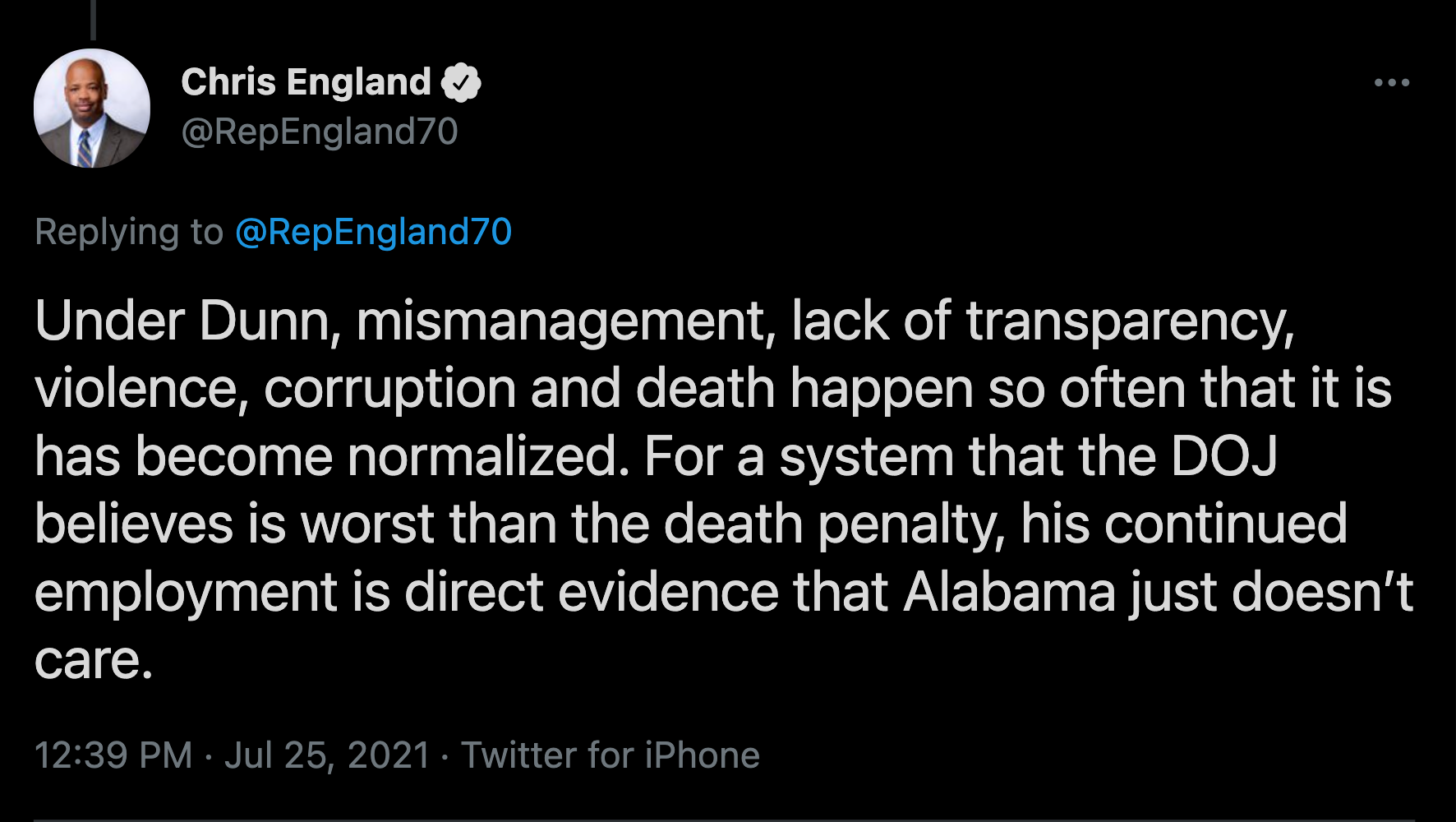 State Rep. Chris England, a Democrat from Tuscaloosa who also chairs the state Democratic Party, has been an outspoken proponent for criminal justice reform throughout his career and over the weekend set his sights first on ADOC Commissioner Jeff Dunn. He then insisted that while poor management is to blame for the recent deaths, ADOC officials also routinely sweep information under the rug and away from the public eye.