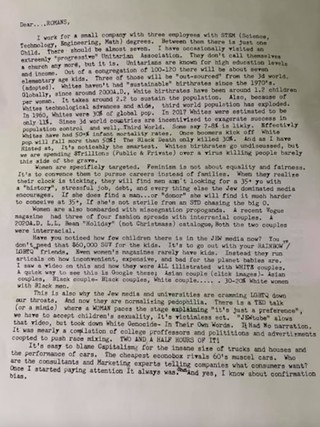 For instance, at one point in the letter, which begins "Dear .... Romans," the author provides unsourced statistics as he opines on troubles facing the African-American community, writing "OUR Jew dominated universities and media tell us it's because of poverty, the legacy of JimCrowSlaveryandmicro-aggressions [sic]. But then they tell us LGBTQ are Born that Way."