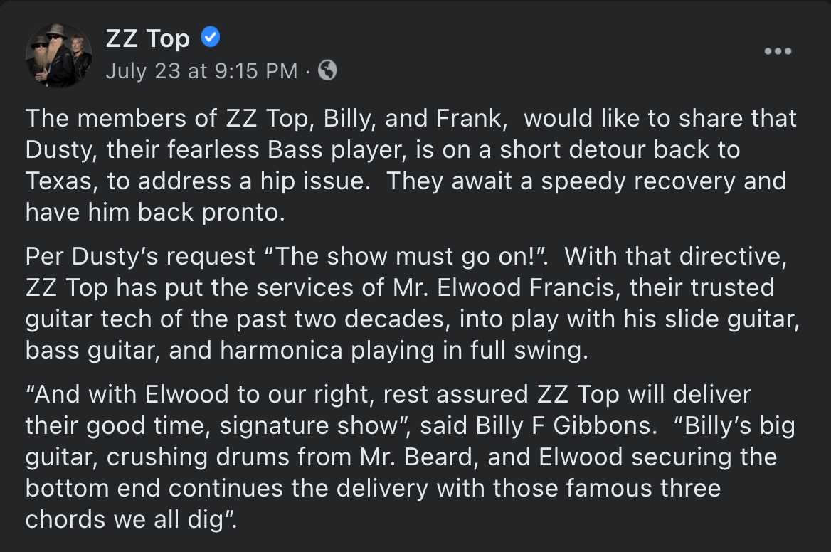 The band informed fans of the news about Hill, 72, and wished him a speedy recovery, before saying Elwood Francis — the group's guitar tech for the last two decades — will fill in on bass, slider guitar and harmonica.