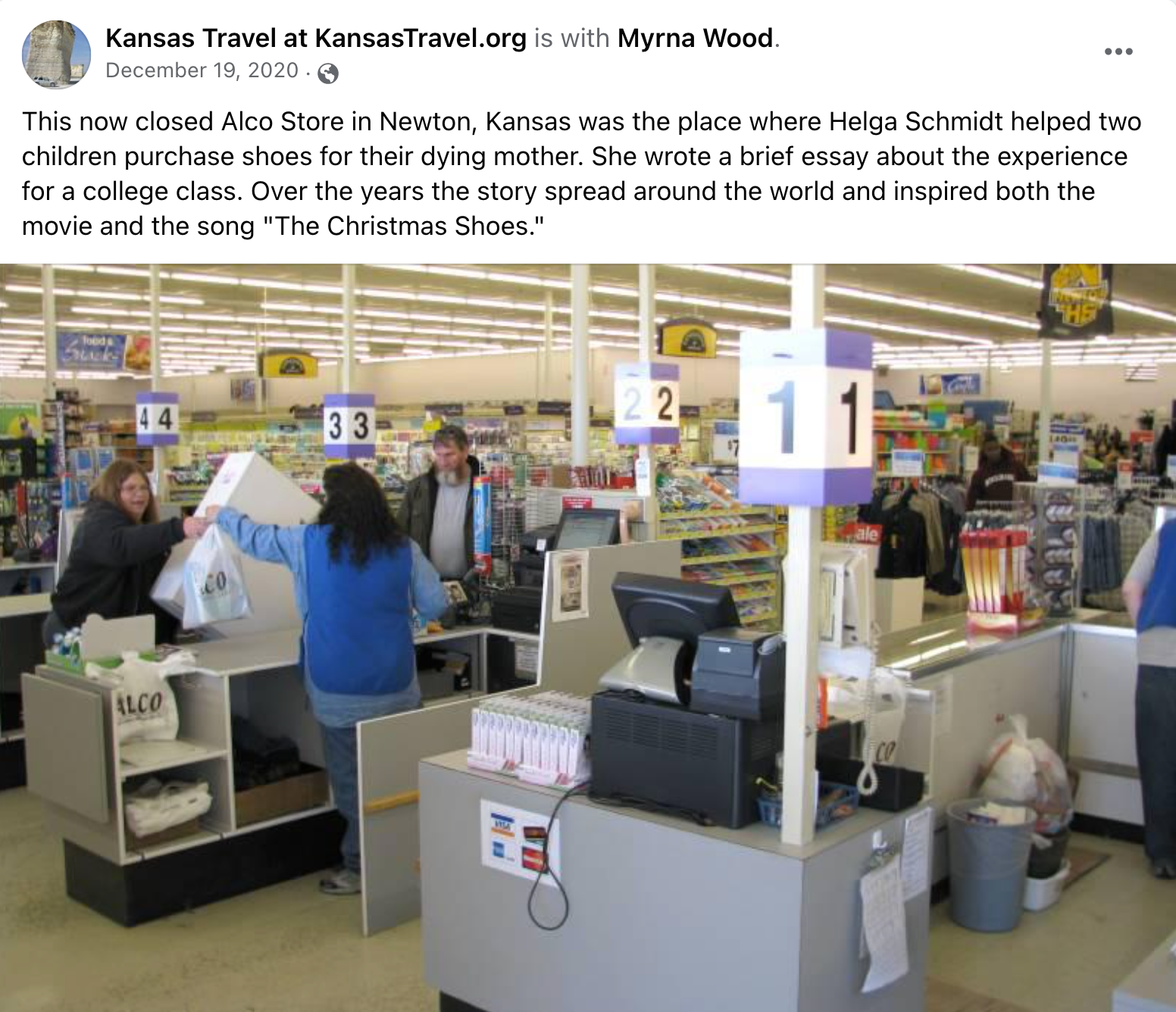 As the tale goes, it was in Newton, Kansas in the 1980s when Schmidt stood in line while Christmas shopping when she noticed a young boy and his sister ahead of her hoping to buy a pair of gold-colored women's shoes. The children were reportedly $3 short, which prompted Schmidt to cover the difference. It was only after the fact that the writer learned the children were buying the shoes for their dying mother.