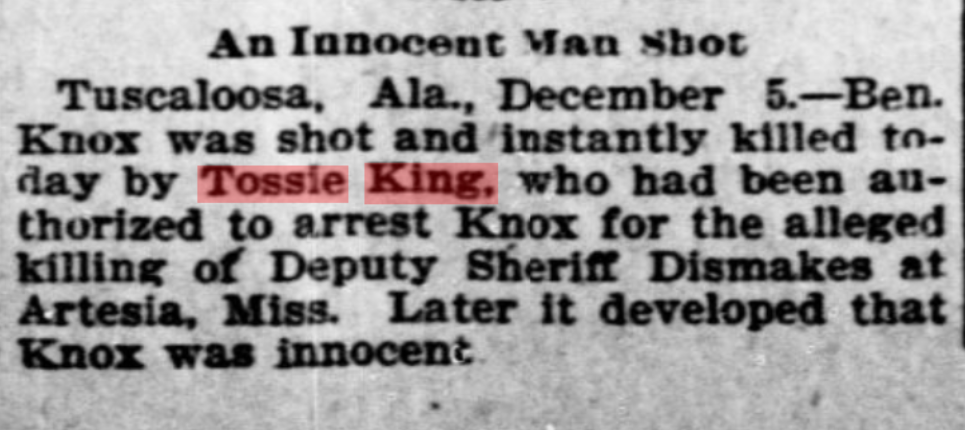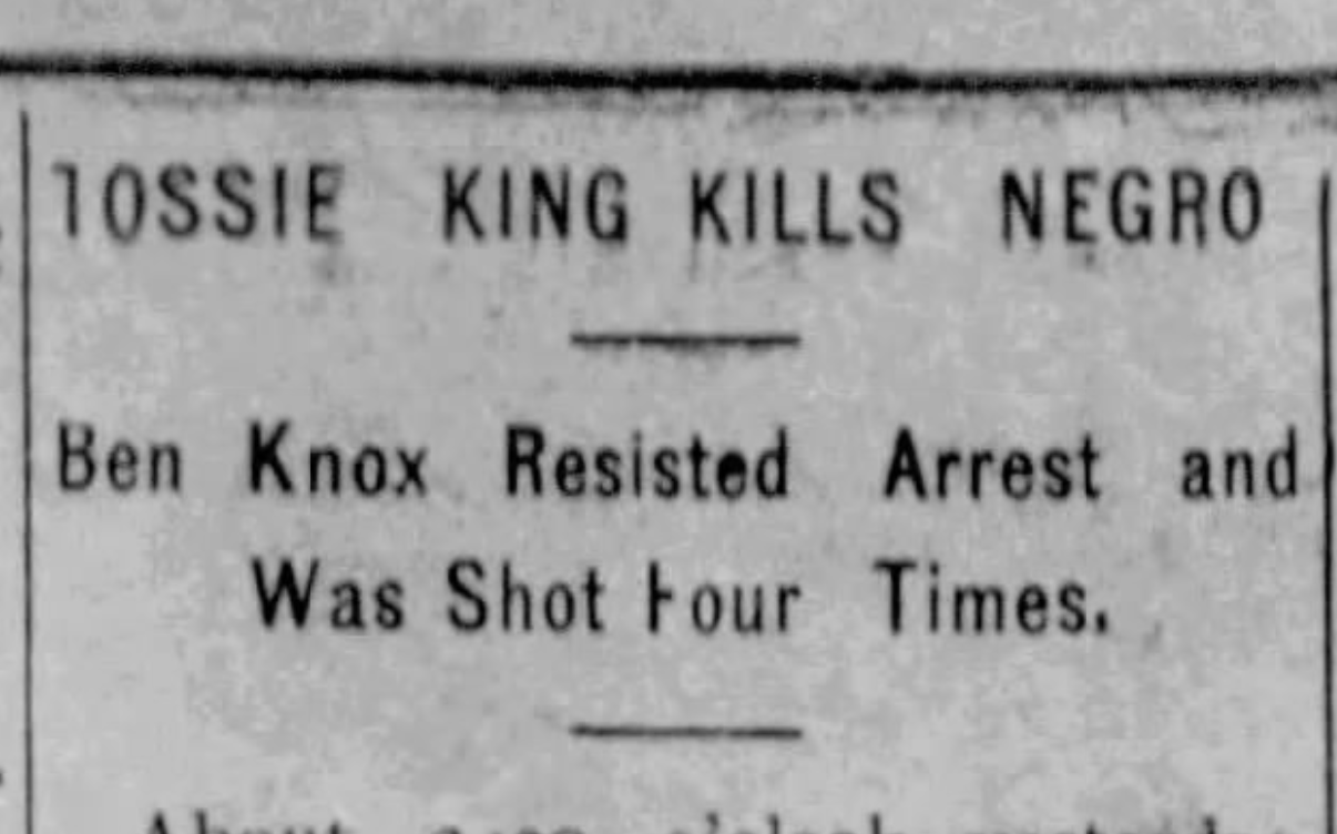 The Tuscaloosa Gazette reported the next day that King and a Tuscaloosa policeman located Knox at the Tuscaloosa Oil Mill and King pursued him into a boiler room of the plant. Testimony from the other officer said King ordered Knox to throw up his hands and give up, but the man appeared to reach for a gun or weapon and King shot him four times, killing Knox where he stood.