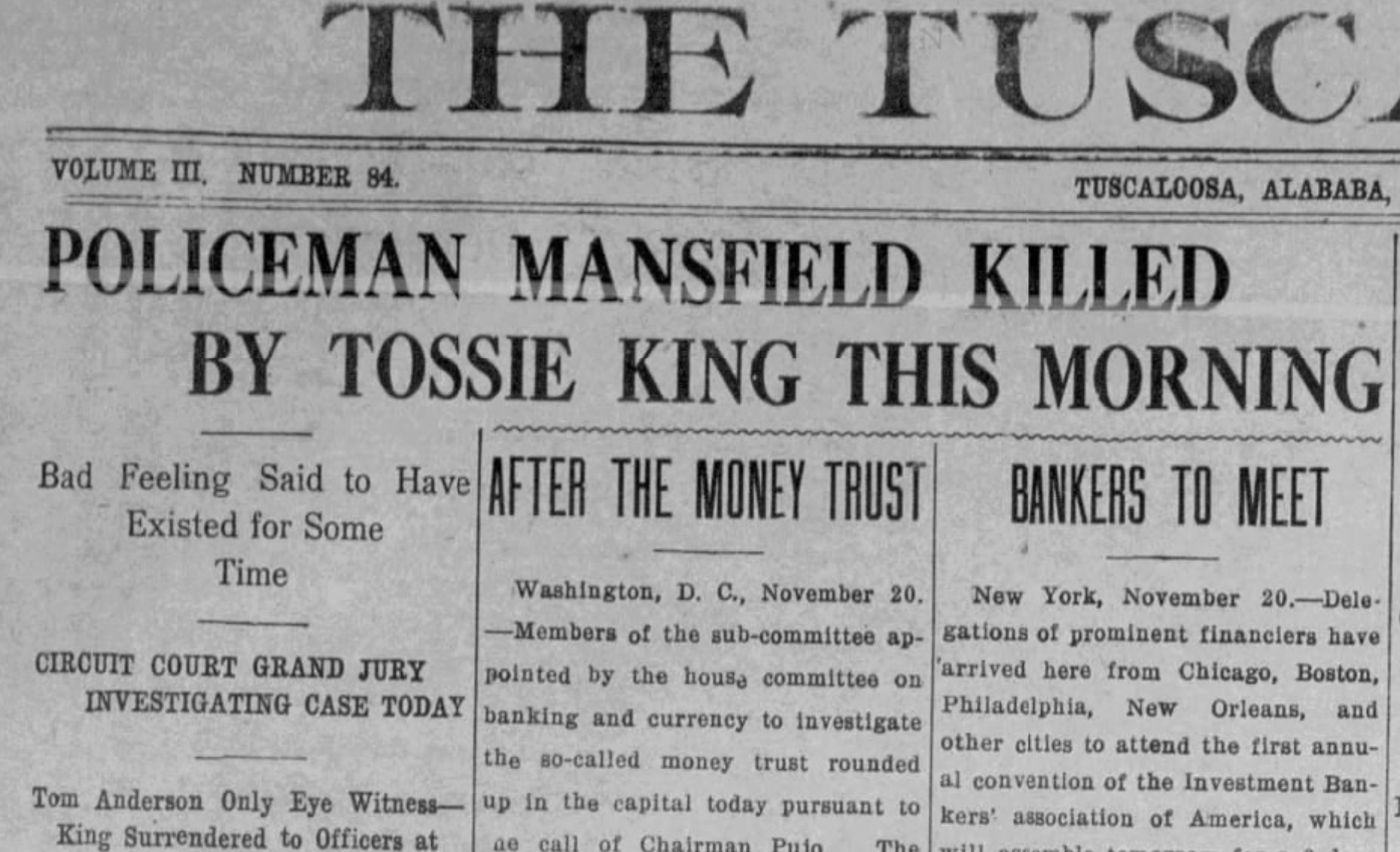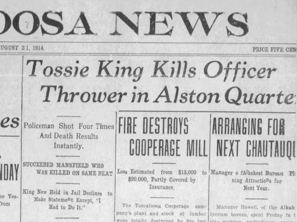 In this early chapter of Tuscaloosa history, Tossie King now had the first two killings of Tuscaloosa city police officers to his name.