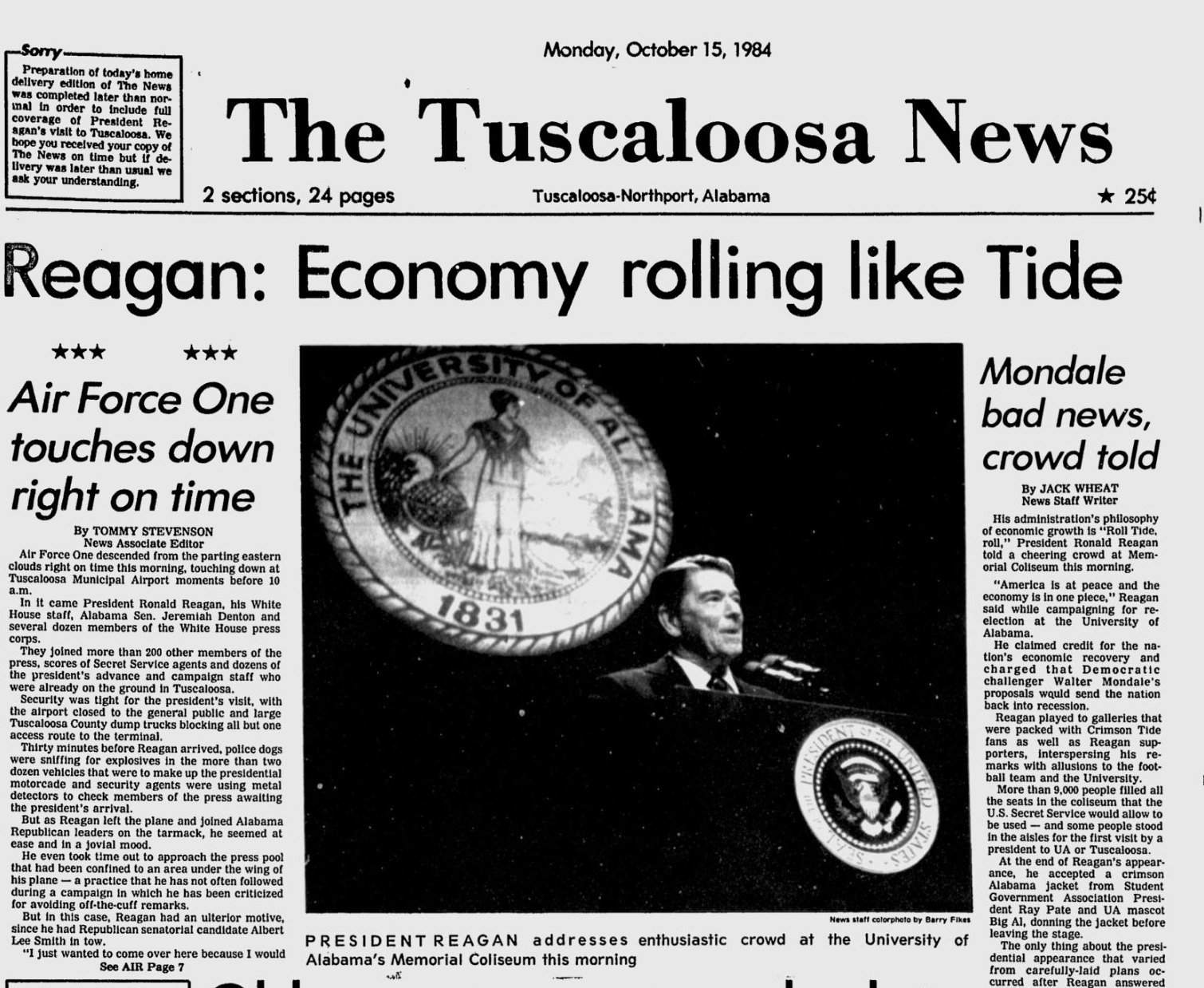 Air Force One touched down at the Tuscaloosa Municipal Airport at 12:25 p.m. on Oct. 15, 1984, where it was greeted by throngs of onlookers and security personnel. Roughly seven miles away, however, many waited in the rain and elements for hours outside the coliseum on the University of Alabama ahead of the visit.