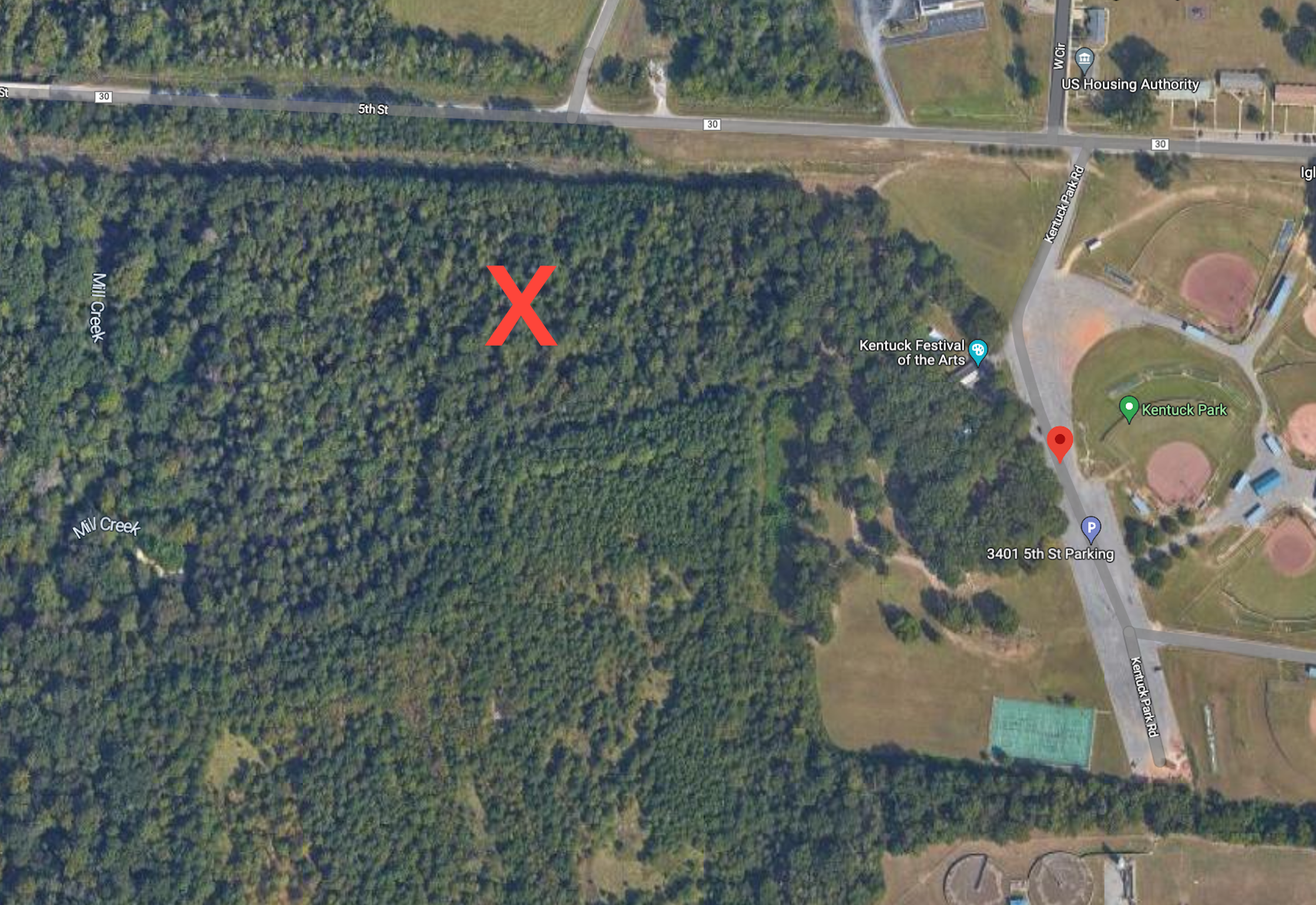 Here's a Google Earth satellite view of the property, with 5th Street running along the top and Kentuck Park visible on the righthand side.