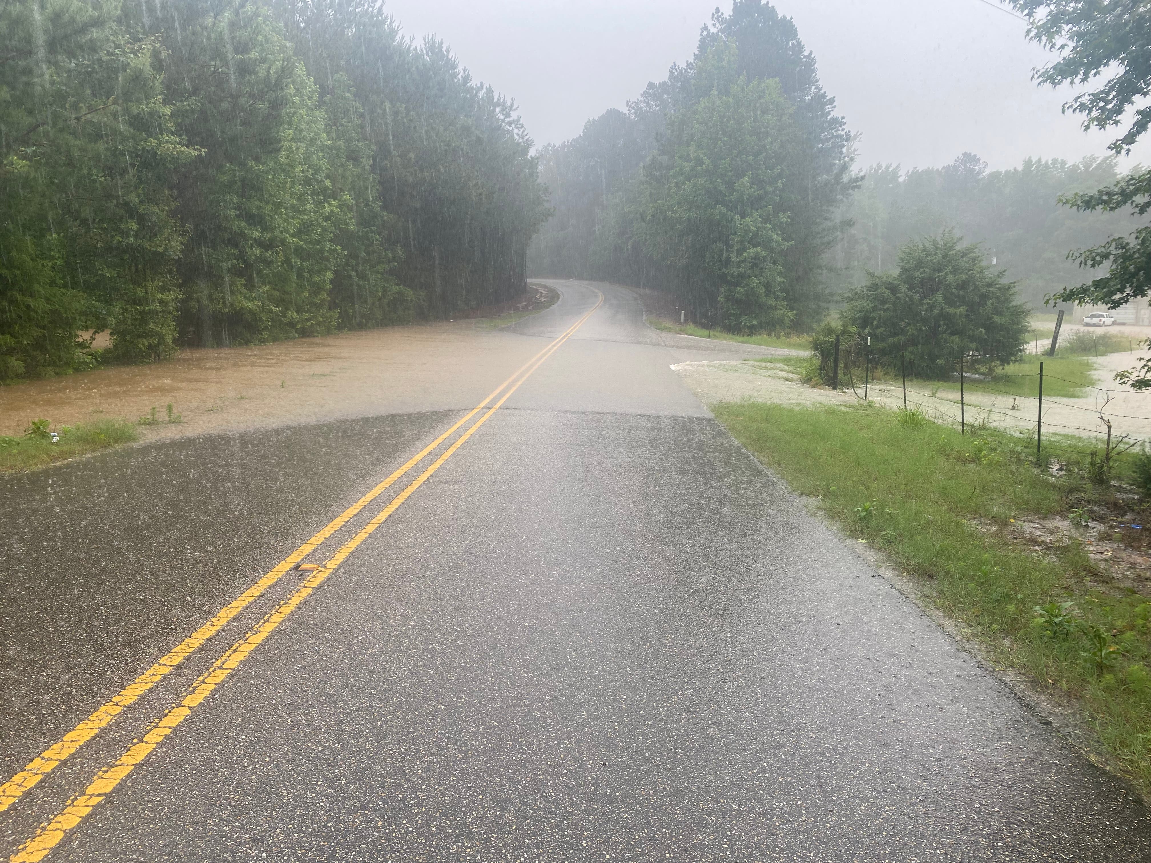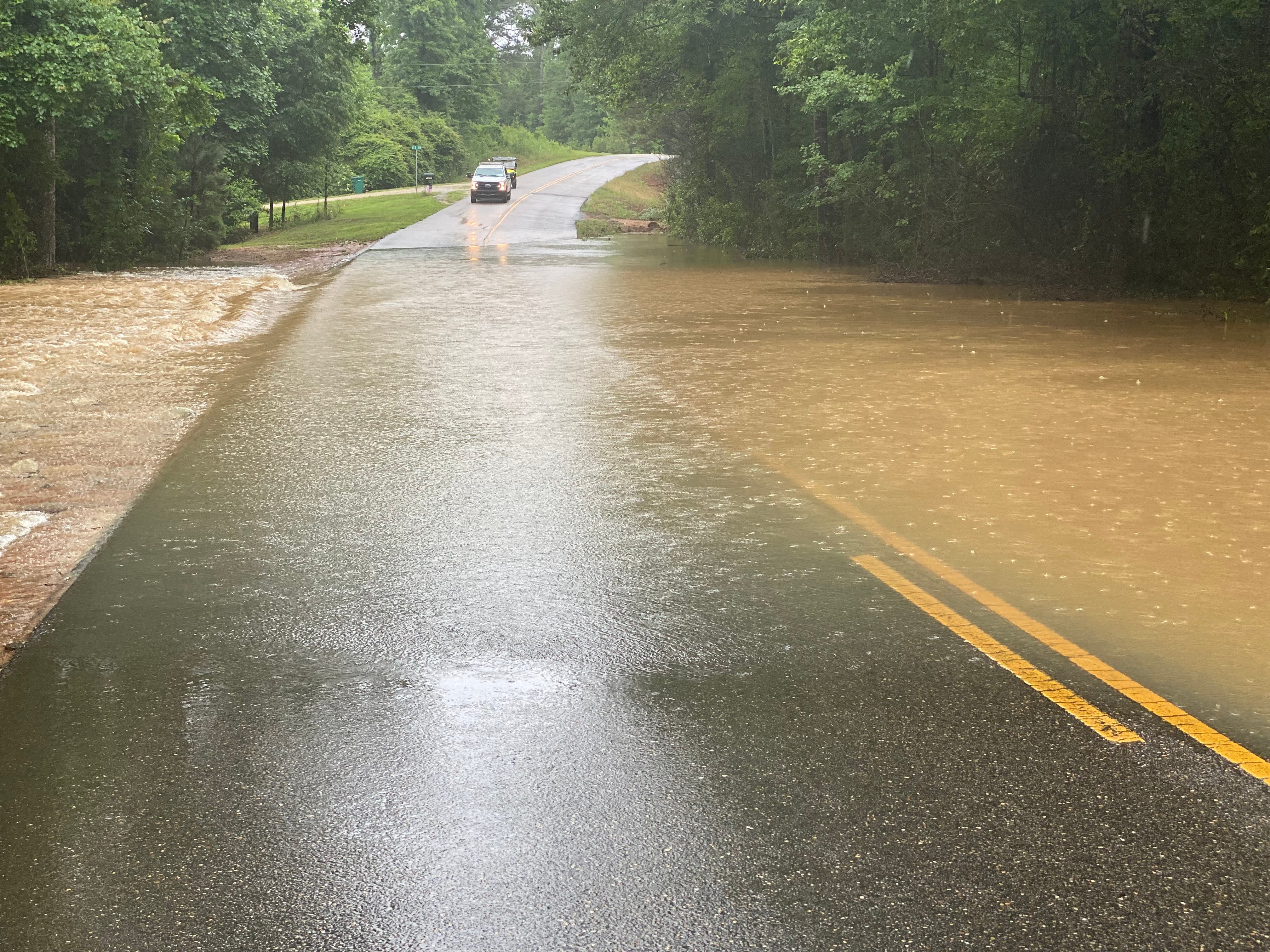 Roughly three miles from the Tilly Branch flood, water from Wards Mill Creek also covered a large part of Jackson Trace Road near Lee Drive, forcing the county to close the road as rain came down at one of its hardest points of the day.