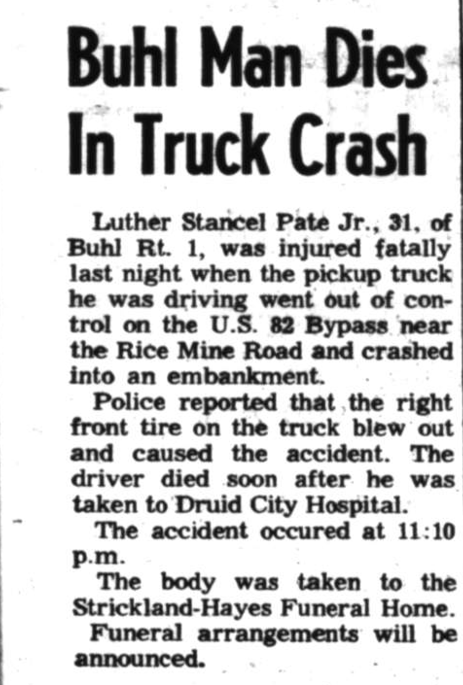 Appearing on the front page of the Tuscaloosa News and erroneously identifying his father as Luther Stancel Pate, Jr., the article quoted police in saying it was believed that the right front tire blew out on the truck he was driving, causing him to lose control and crash into an embankment. The crash occurred just after 11 p.m. and Pate told Tuscaloosa Patch his father had successfully purchased the farm from his grandmother, but had to take night jobs to make ends meet.