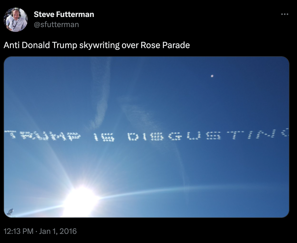 In looking back at his dinner with Trump, it's important to remember that Pate is the same enduring force that grabbed national headlines for his "Trump is Disgusting" skywriting at the Rose Bowl in 2016 — six years after similarly flying a banner in Pasadena calling for Republican Gov. Bob Riley to be impeached.