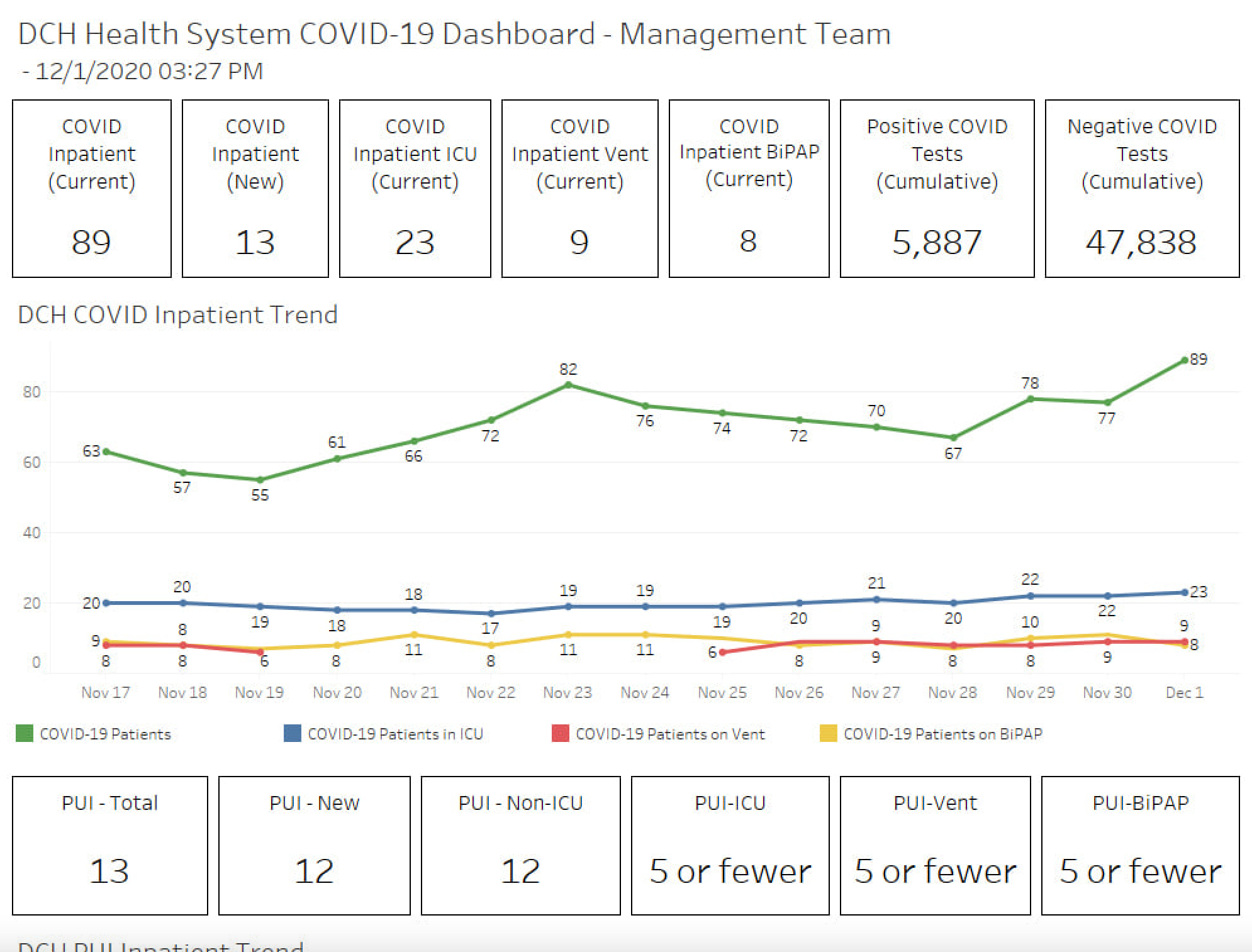 - DCH reported adding 13 new coronavirus hospitalizations Tuesday, but saw its day-to-day total decrease from 91 to 89. However, 52 new inpatient cases have been admitted over the last three days.