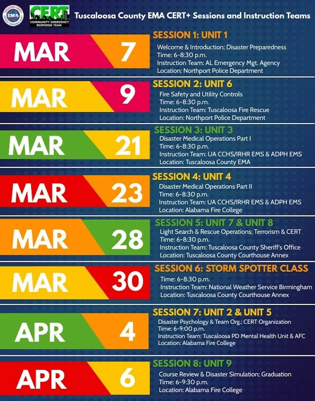 The training is open to anyone age 18 and older, with classes held as a series of eight 2.5-, 3-, or 3.5-hour sessions. Tuscaloosa County EMA says all of the class locations will be held in Tuscaloosa County.