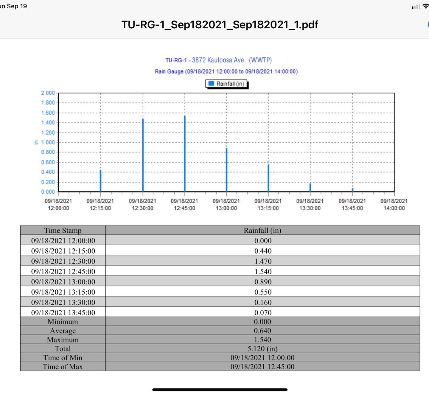 Maddox said a rain gauge (RG-1) on Kauloosa Avenue recorded 5.12 inches of rain from 12:15 p.m. to 2:00 p.m. Saturday, with another 0.11 inches coming from lighter showers later in the day.