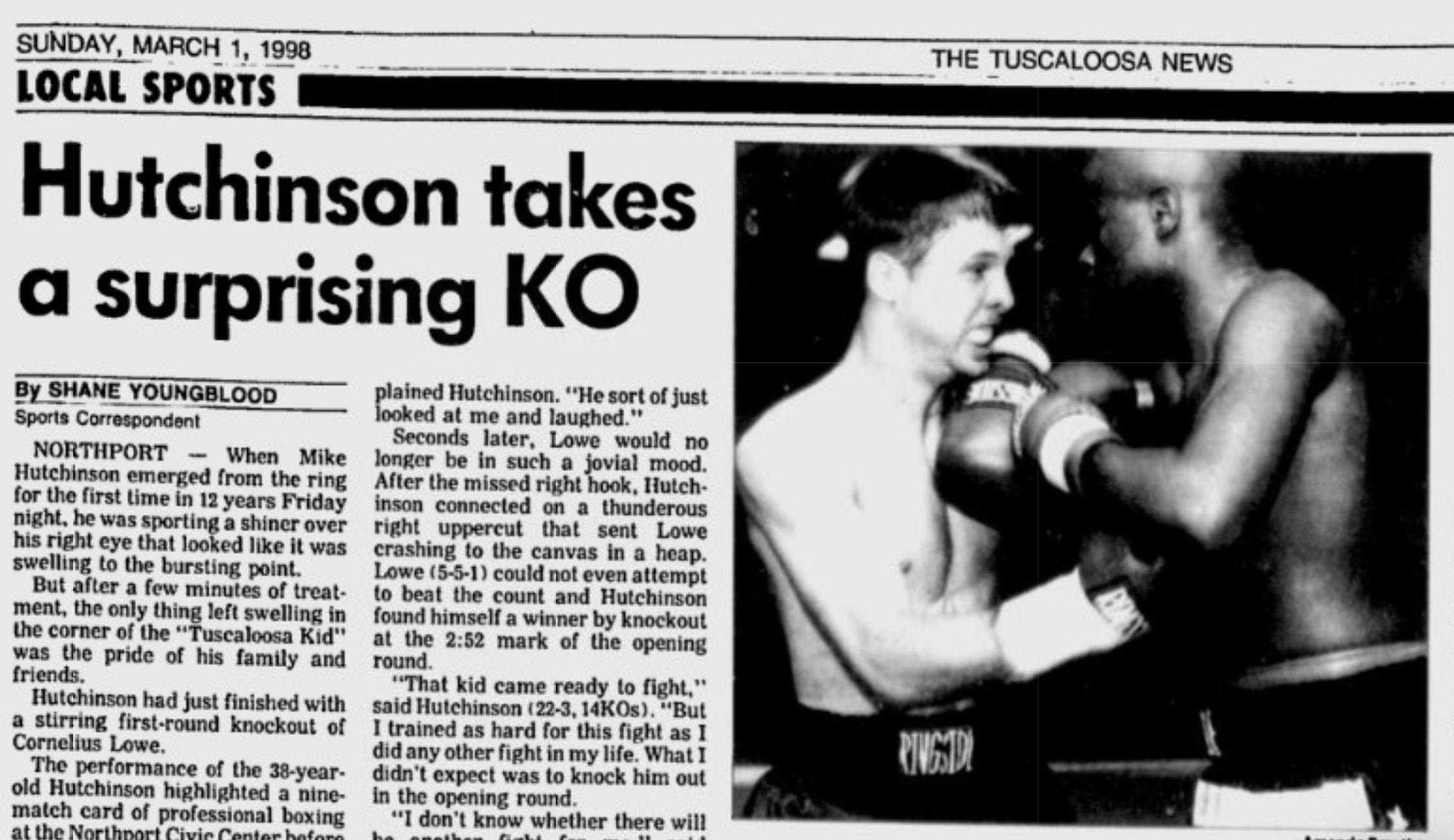 Lowe failed to beat the count and the Tuscaloosa Kid — now a husband, father, boxing trainer and respected brick mason — saw his fist raised by the official after the 2:52 mark of the opening round.