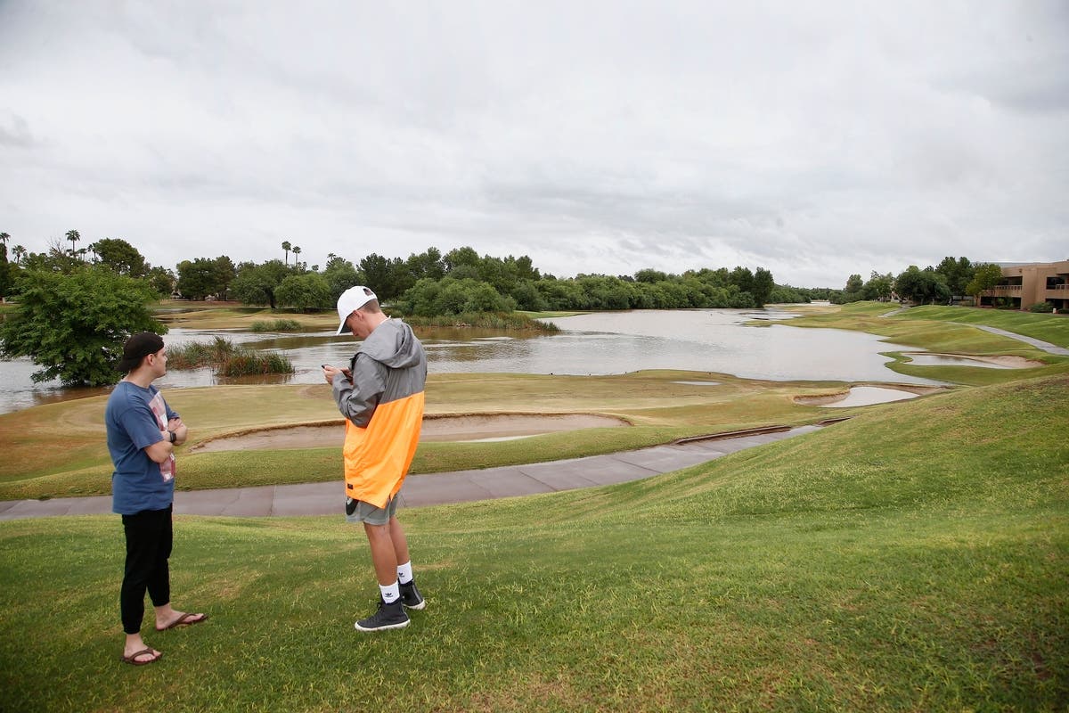 Phoenix's Stonecreek Golf Course is seen practically underwater as onlookers check out the devastation. (Photo credit: AP Photo/Ross D. Franklin)
