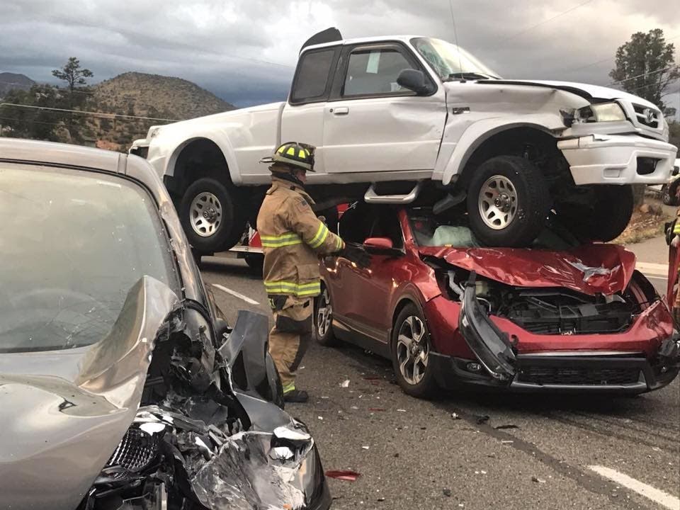 The impact of that collision caused her pickup to flip through the air and land on top of the red car, the fire department said in a news release on the Yavapai County Sheriff’s Office Facebook page.