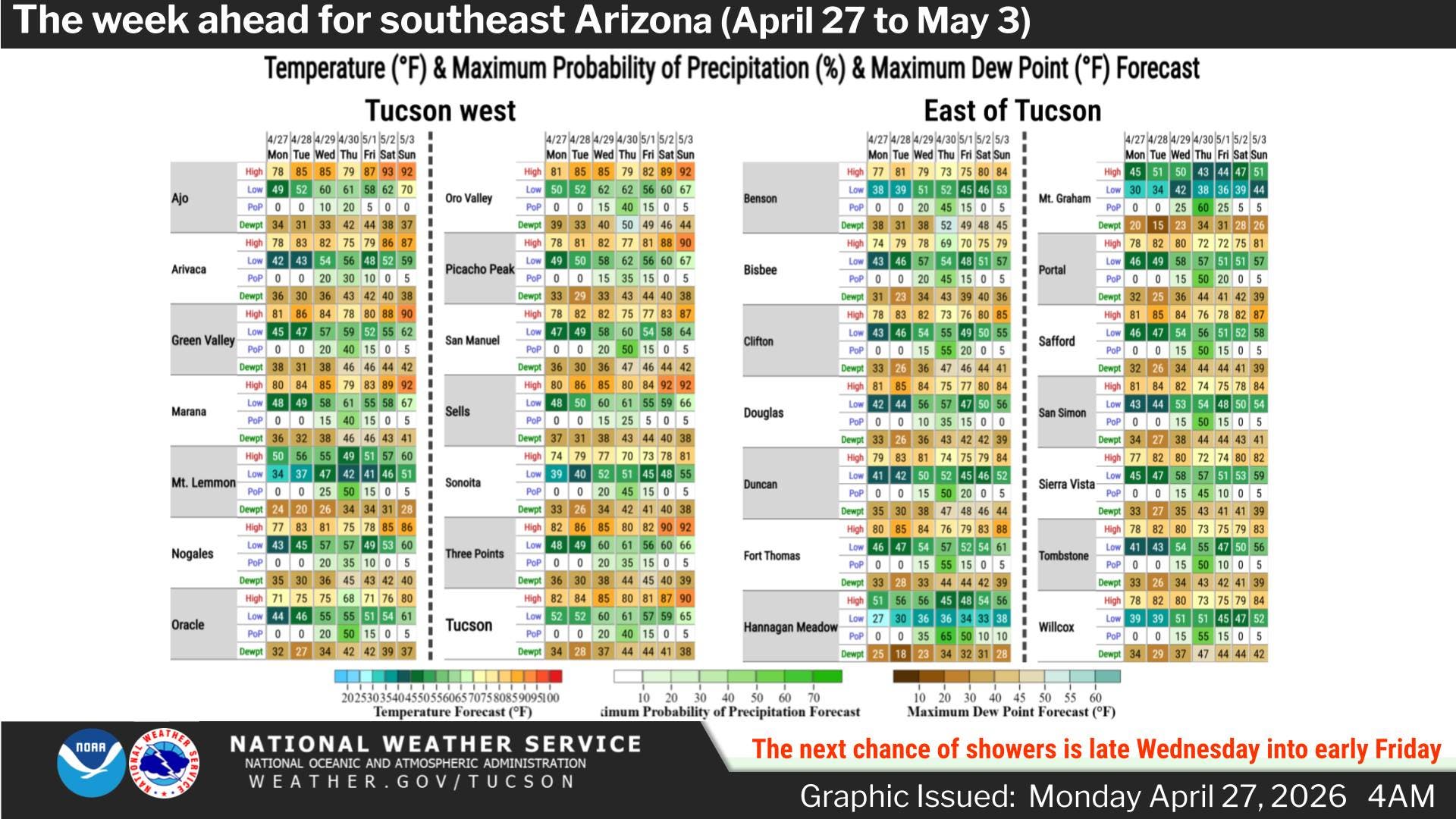 Lighter winds and warming temperatures are on the way, but a late-week storm system could bring showers to southern Arizona before a drier, warmer weekend arrives, according to the National Weather Service in Tucson.