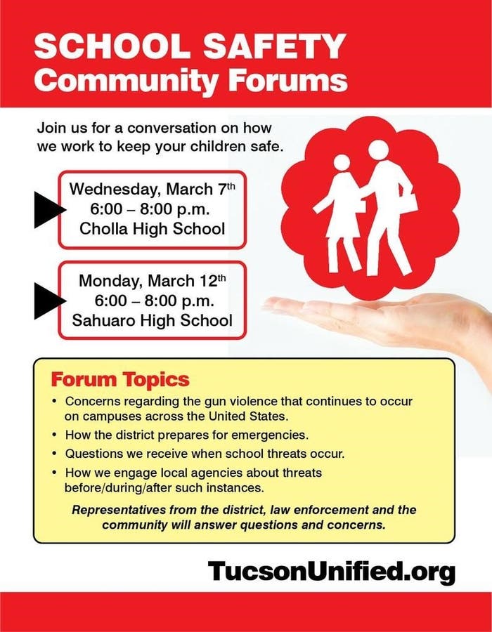 The Tucson Unified School District plans two school safety forums – Wednesday and Monday. And if you can't make it, you can watch online.