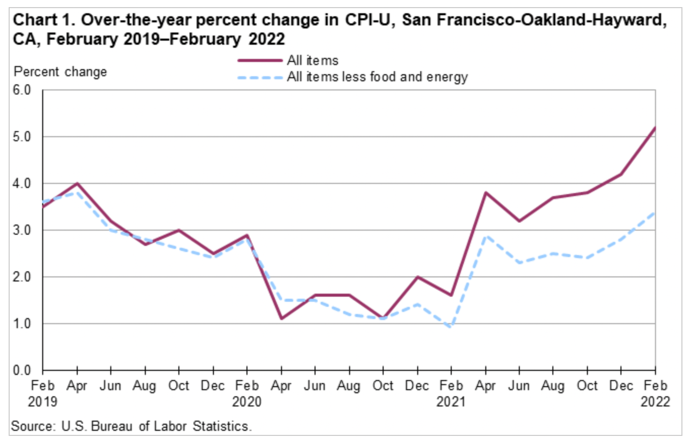 In Northern California, the most recent data set from February showed that food prices increased 9 percent, housing prices surged 2.4 percent and alcoholic beverage prices rose 1.3 percent from February of last year. The price of meats, poultry, fish and eggs raised 10.7 percent.