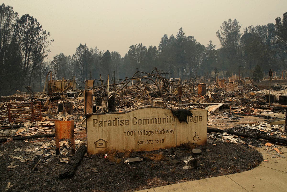 A sign stands at a community destroyed by the Camp fire in Paradise, CA. Most homes are gone, as are hundreds of shops and other buildings. The supermarket, the hardware store, Dolly-O-Donuts & Gifts where locals started their day with a blueberry fritter and a quick bit of gossip, all gone. The town quite literally went up in smoke and flames in the deadliest, most destructive wildfire in California history. (AP Photo/John Locher, File)