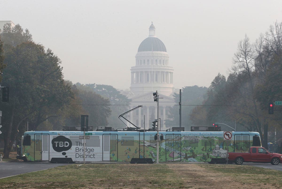 A light-rail train passes in front of the smoke shrouded state Capitol in Sacramento, CA. Smoke from the Camp Fire that burned through the Butte County city of Paradise is creating a health hazard that experts say could lead to an increase in serious health problems, especially for children and the elderly. (AP Photo/Rich Pedroncelli)