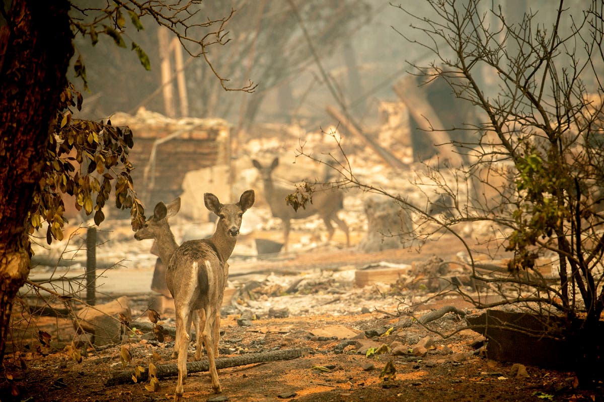A deer walks past a destroyed home on Orrin Lane after the wildfire burned through Paradise, CA. (AP Photo/Noah Berger, File)