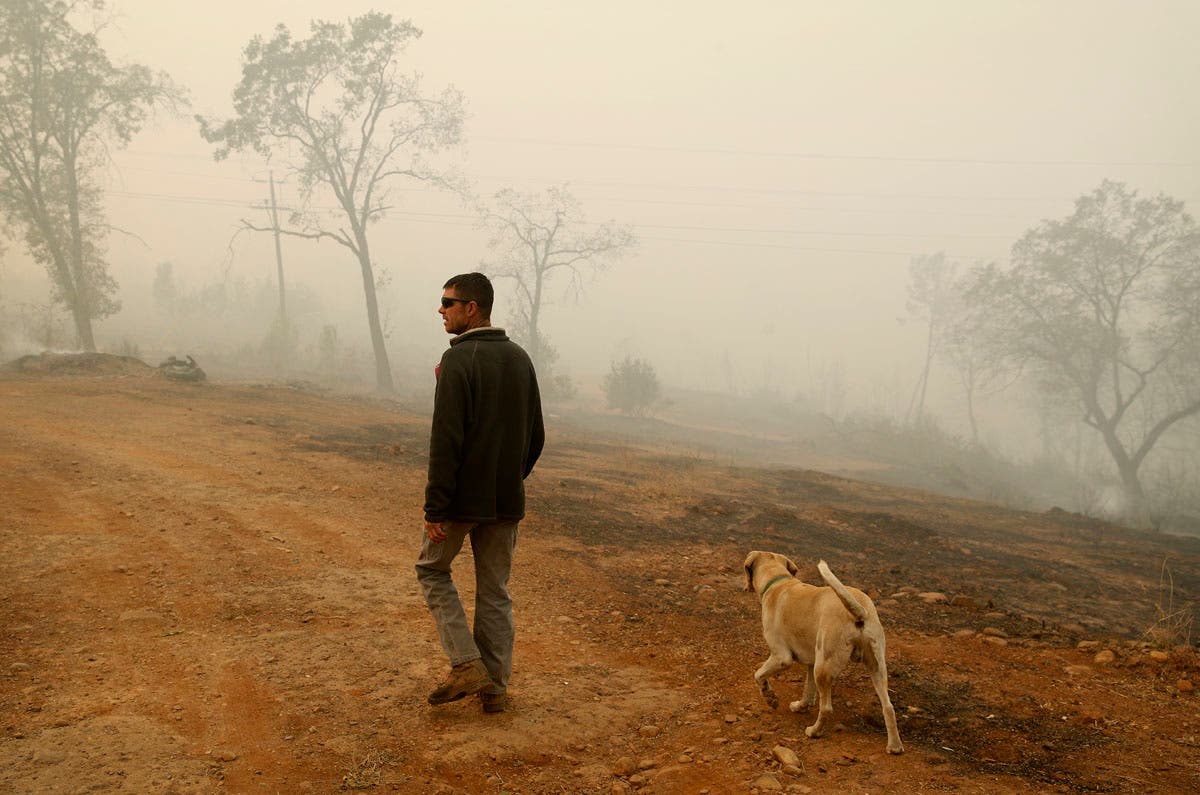 Patrick Knuthson walks along his property near trees burned in the Camp Fire in Paradise, CA. Knuthson a fourth-generation local struggled to make sense of what he was seeing. He pointed out what used to be a saloon-style pub, his favorite Mexican restaurant, a classic California motel, the pawn shop, a Real Estate office, a liquor store, entire trailer parks and other places. (AP Photo/John Locher)