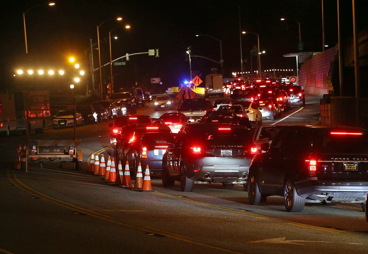 A long line of residents seeking to return to Malibu, Calif., in Southern California wait at a checkpoint on Pacific Coast Highway after Woolsey Fire evacuation orders were lifted for the eastern portion of the city. (AP Photo/Reed Saxon)