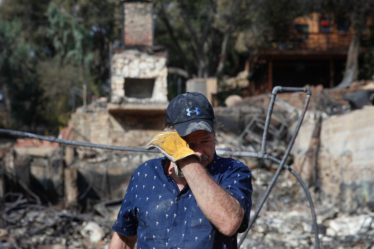 Roger Kelton, 67, wipes his tears while searching through the remains of his mother-in-law's home burned down by the Woolsey Fire in Agoura Hills, CA. "We saw the pictures Friday of the house on fire," said Kelton. "We knew it was gone but still haven't had my good cry yet. I've been trying to be strong for my daughter, my wife and my mother-in-law." (AP Photo/Jae C. Hong)