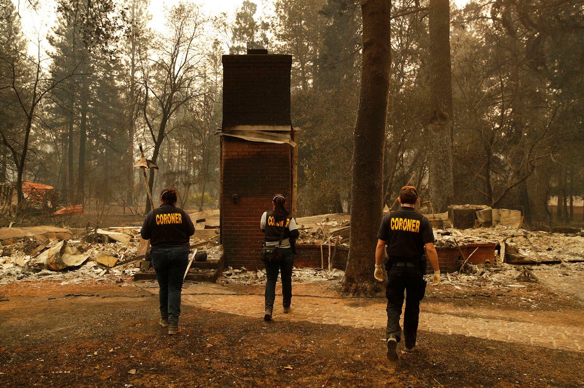 Members of the Sacramento County Coroner's office look for human remains in the rubble of a house burned at the Camp Fire in Paradise, CA. (AP Photo/John Locher)