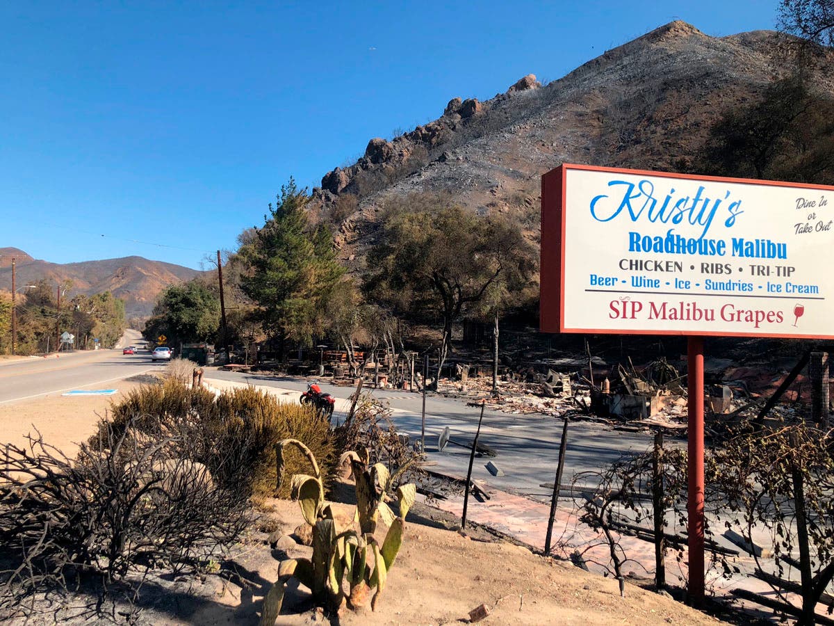The sign is all that remains of Kristy's Roadhouse Malibu restaurant, Sunday, Nov. 11, 2018, after flames tore across hillsides in canyon areas in Agoura Hills, CA. Strong Santa Ana winds returned to Southern California on Sunday, fanning a huge wildfire that has scorched a string of communities west of Los Angeles. (AP Photo/Christopher Weber)