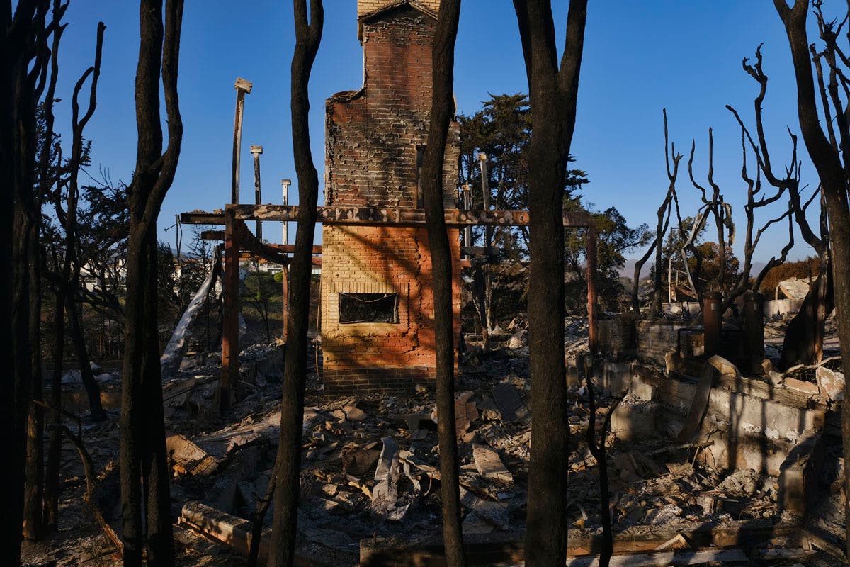 Burned trees surround a destroyed home leaving only the fireplace in Point Dume in Malibu, CA. (AP Photo/Richard Vogel)