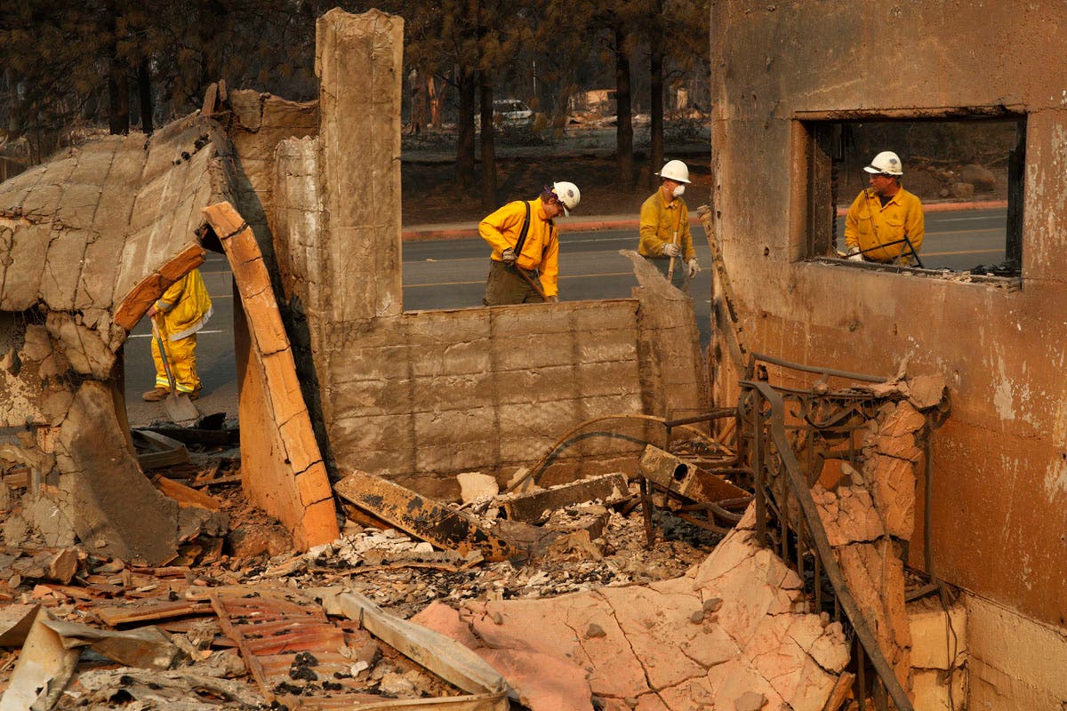 Volunteer rescue workers search for human remains in the rubble of homes burned in the Camp Fire in Paradise, CA. Dozens of people died and perhaps several hundred are unaccounted for in the nation's deadliest wildfire in a century. (AP Photo/Terry Chea)