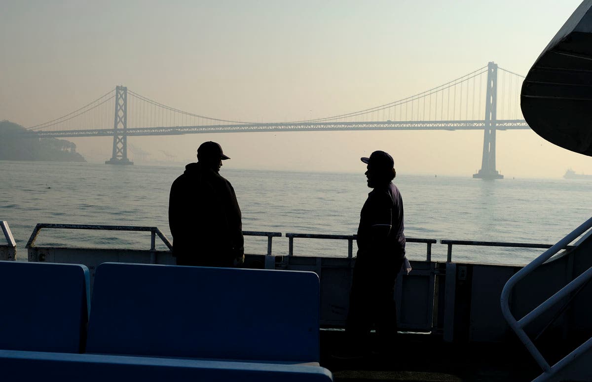 A pair of deckhands on a commuter ferryboat talk as the San Francisco-Oakland Bay Bridge is obscured by wildfire smoke and haze in San Francisco. (AP Photo/Eric Risberg)