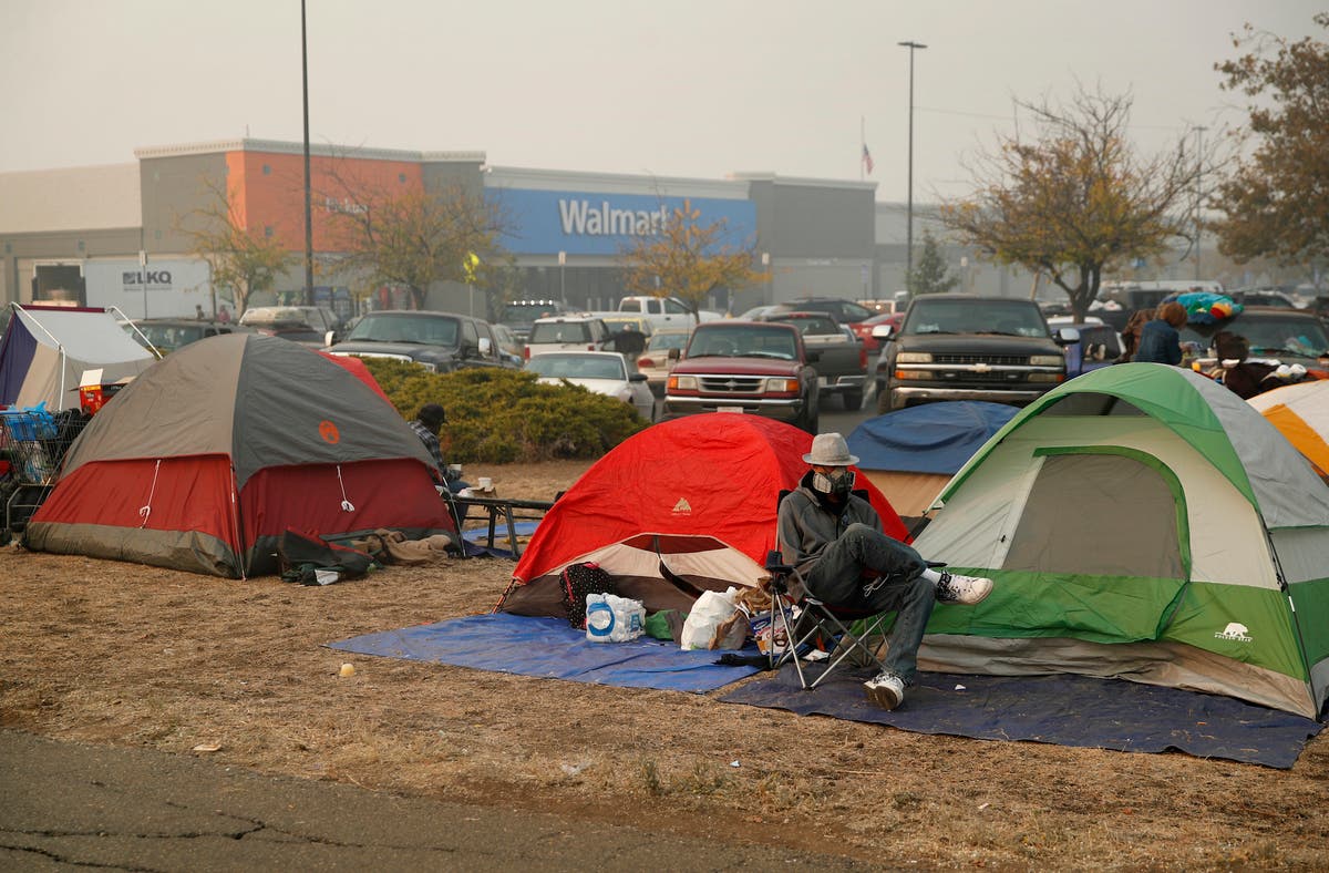 People sit by their tents at a makeshift encampment outside a Walmart store for people displaced by the Camp Fire in Chico, CA. (AP Photo/John Locher)