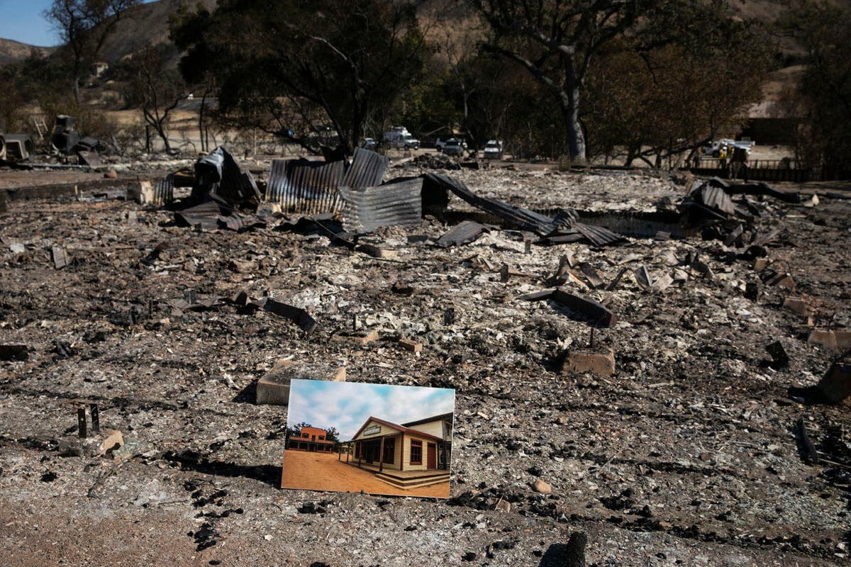 A before photo is placed on the remains of a building leveled in the Woolsey Fire at decimated Paramount Ranch during U.S. Secretary of the Interior Ryan Zinke's visit to the ranch in Agoura Hills, CA. (AP Photo/Jae C. Hong)