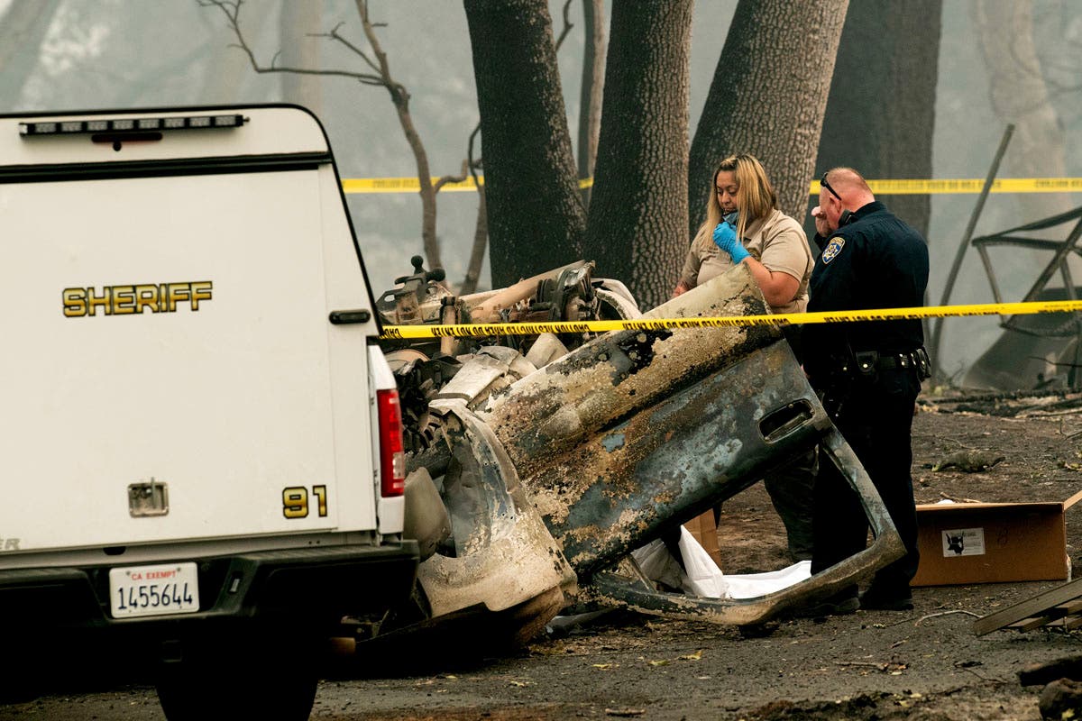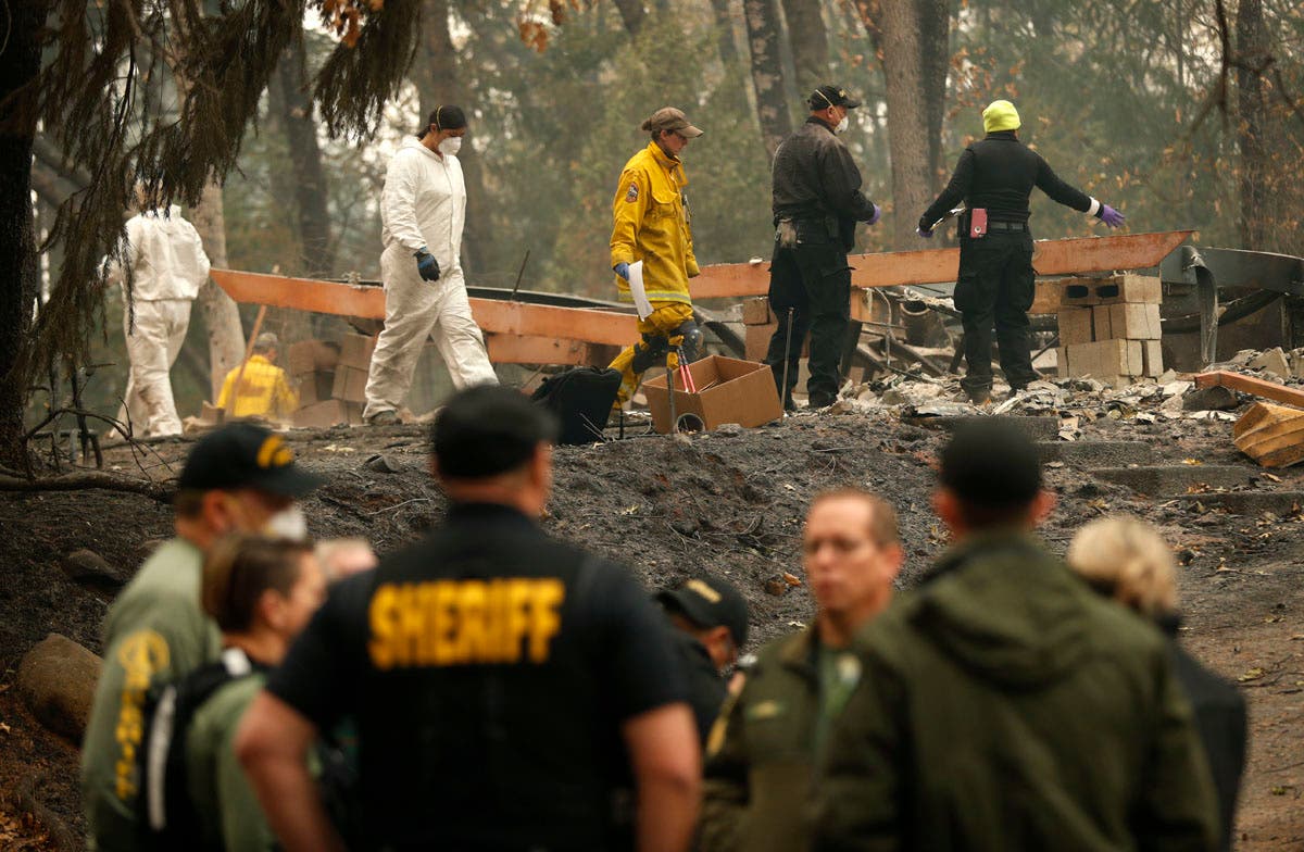 Investigators recover human remains at a home burned in the Camp Fire in Magalia, CA. Many of the missing in the deadly Northern California wildfire are elderly residents in Magalia, a forested town of about 11,000 north of the destroyed town of Paradise. (AP Photo/John Locher)