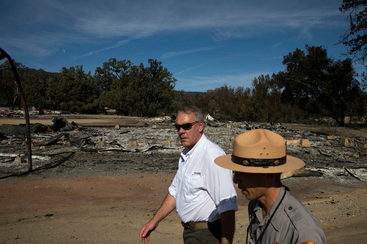 U.S. Secretary of the Interior Ryan Zinke, center, visits decimated Paramount Ranch Thursday in Agoura Hills, CA. The landmark film location was burned to the ground by the Woolsey Fire. (AP Photo/Jae C. Hong)