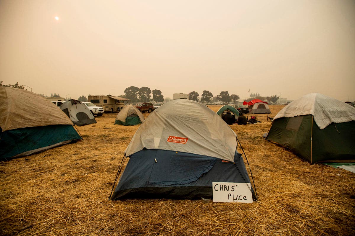 A sign hangs beside a tent at a makeshift shelter for evacuees of the Camp Fire in Chico, CA. (AP Photo/Noah Berger)