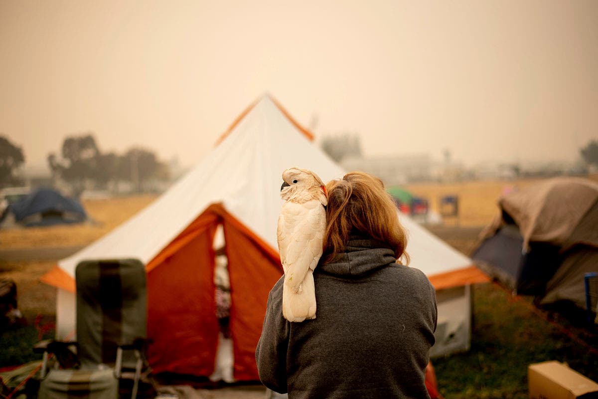 Suzanne Kaksonen, an evacuee of the Camp Fire, and her cockatoo Buddy camp at a makeshift shelter outside a Walmart store in Chico, CA. Kaksonen lost her Paradise home in the blaze. (AP Photo/Noah Berger)