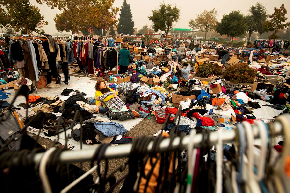 Denise Chester, an evacuee of the Camp Fire, hugs her son Antonio Batres as she volunteers sorting clothes at a makeshift shelter in Chico, CA. Chester, who doesn't want to know yet whether her home survived, said "I want to help. I don't want to shut down." (AP Photo/Noah Berger)