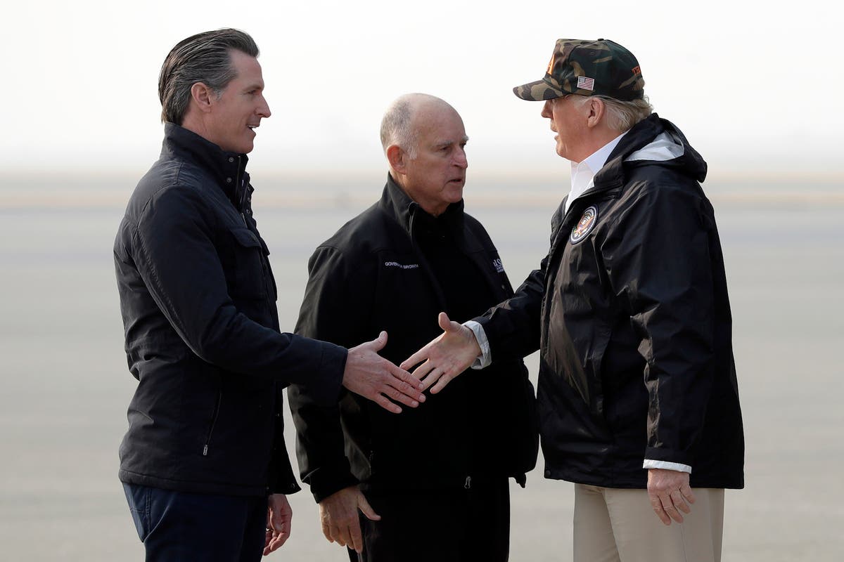 President Donald Trump talks with from left, Gov.-elect Gavin Newsom, California Gov. Jerry Brown, Paradise Mayor Jody Jones and FEMA Administrator Brock Longduring a visit to a neighborhood destroyed by the wildfires in Paradise, CA. (AP Photo/Evan Vucci)